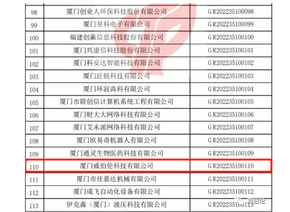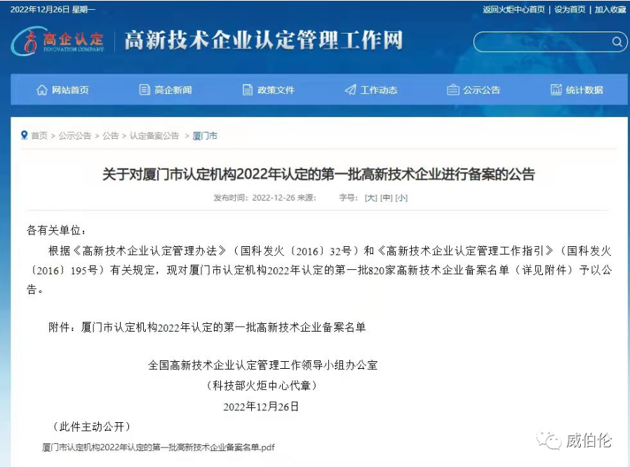 12月26日,全国高新技术企业认定管理工作领导小组办公室发布《关于对厦门市认定机构2022年认定的第一批高新技术企业进行备案公告》,厦门威伯伦通过申报和评审,从万千企业中脱颖而出,成功荣获“国家高新技术企业”认定,此次入选标志着厦门威伯伦的技术创新能力、专业水平、产品质量、服务水平又一次获得认可和肯定。