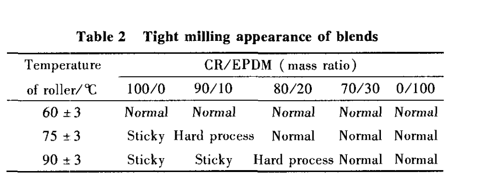 共混胶也容易薄通出片、不黏辊,当CR/EPDM为80/20、辊温在75℃以下时,共混胶可达到正常的弹性状态,顺利进行薄通操作。