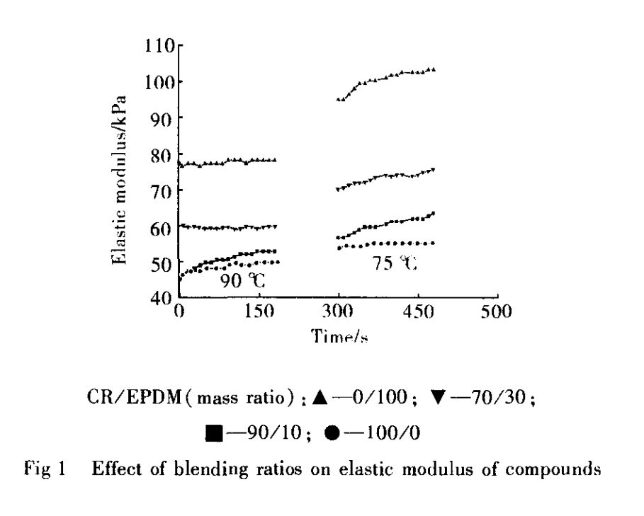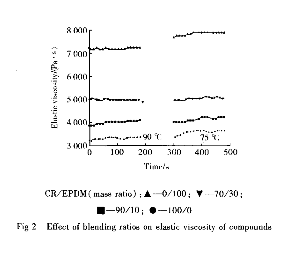 炼工艺性能的研究未见系统深入的报道。本工作研究了不同共混比下的CR/EPDM共混胶随温度变化的黏弹性以及混炼薄通工艺性能,以期在改善低硬度CR的混炼工艺性能方面有实际指导意义。