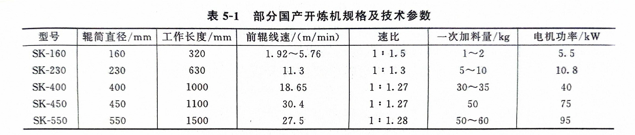 所示为我国常用开炼机的规格及技术参数。