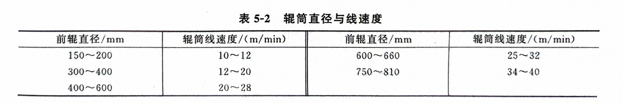 炼机的规格与机器的机械化水平选取。辊筒的线速度与辊筒直径成正比,如表5-2所示。