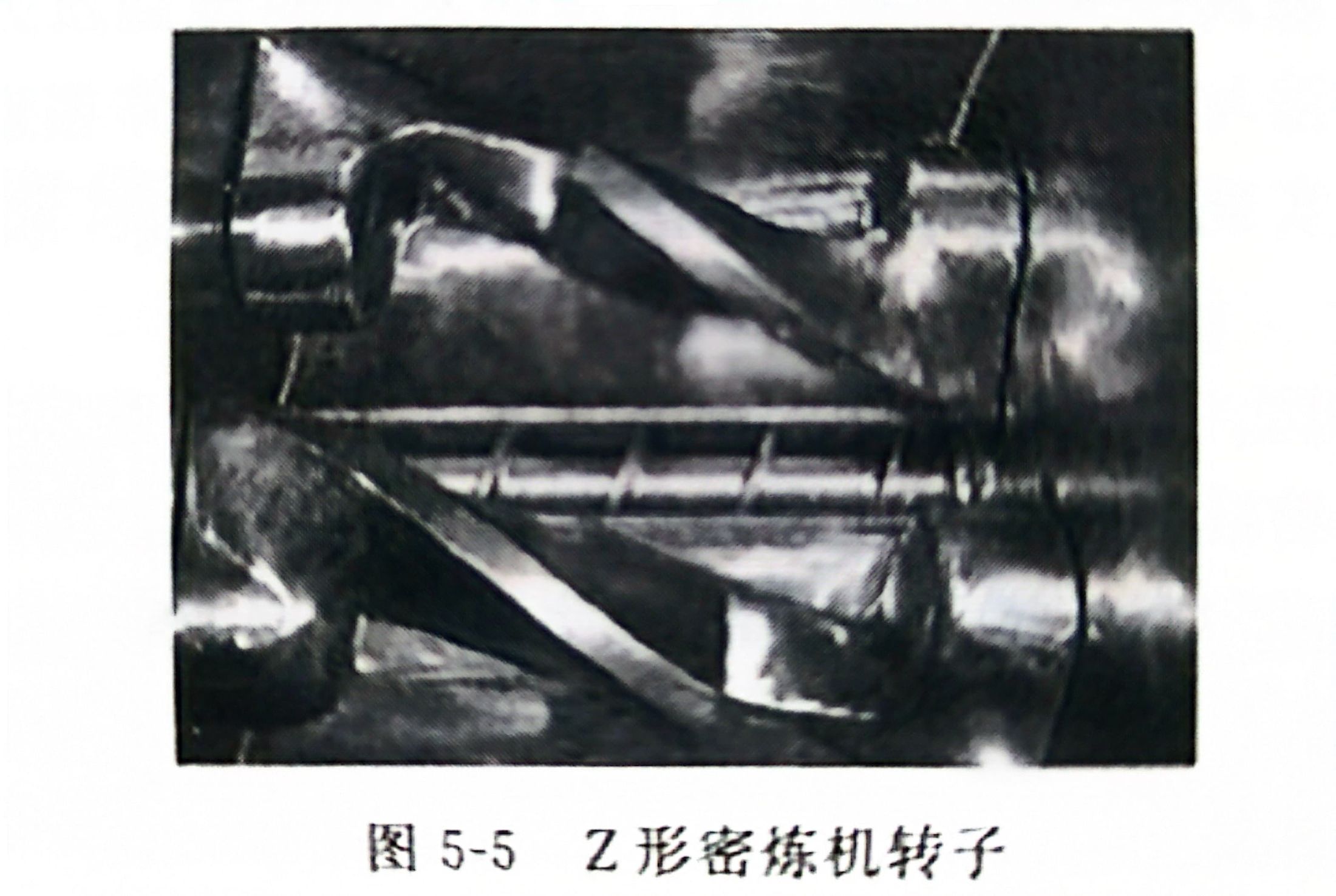 密炼机转子在旋转过程中,由于转子呈Z形(图5-5)或S形,使其与混炼室之间间隙不断变化,因而对物料起着较大的捏炼作用,同时物料在摩擦力的作用下会沿转子作轴向运动,使两