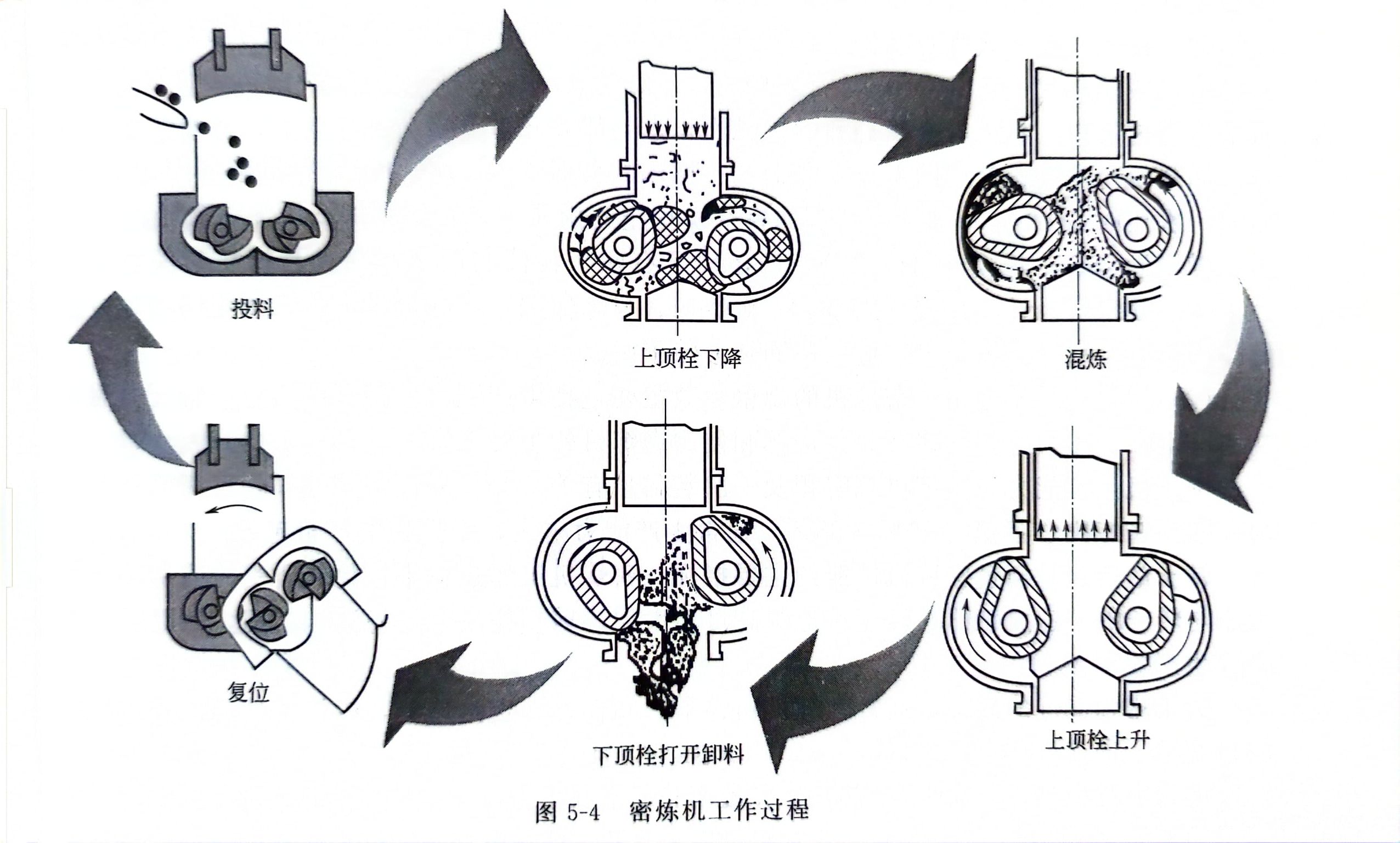 密炼机工作时,物料首先从密炼机加料口投入混炼室,然后压下上顶栓,物料在上顶栓一定压力的作用下压入密炼室。在方向相反并有一定的速比的两个转子的剪切、搅拌等及上下顶栓、转子、密炼室壁的加热作用下,实现对物料的混合、塑化和均化。混炼好的物料可通过开启卸料门将物料排出。其工作过程如图5-4所示。