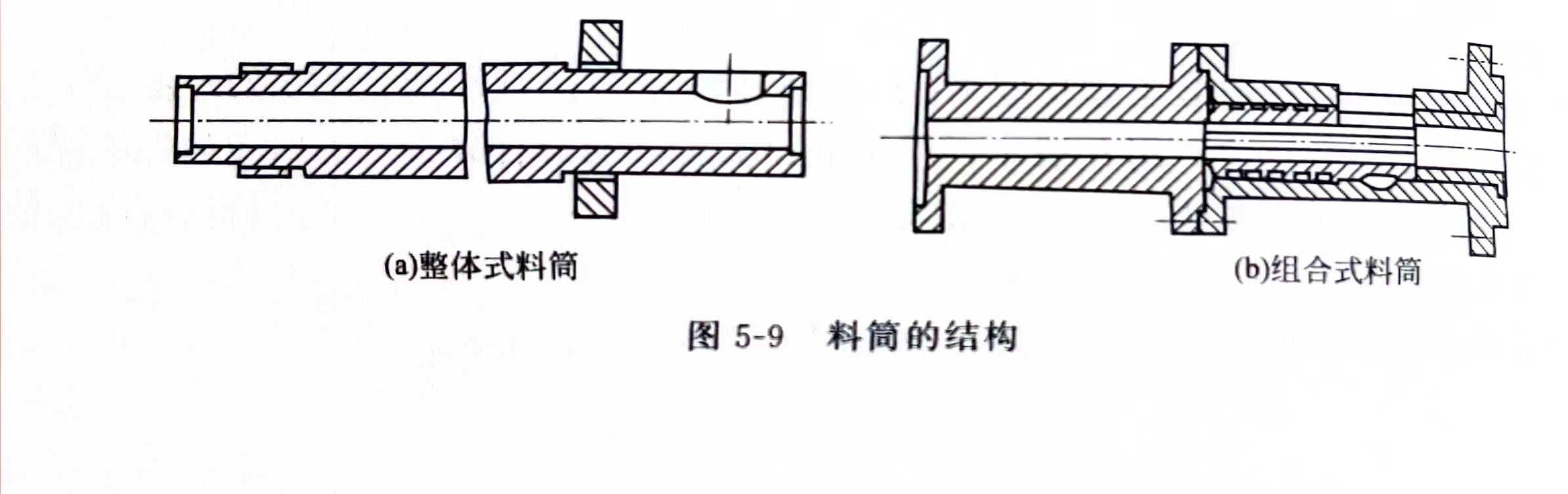单螺杆挤出机料筒结构形式与特点 料筒的结构形式通常有整体式料筒、组合式料筒、衬套式料筒和双金属料筒等几种(图5-9)。整体式料筒是在整体坯料上加工出来的。这种结构容易保证较高的制造精度和装配精度,也可以简化装配工作,便于加热冷却系统的设置和装拆,而且热量沿轴向分布比较均匀,但这种料筒要求较高的加工制造条件。