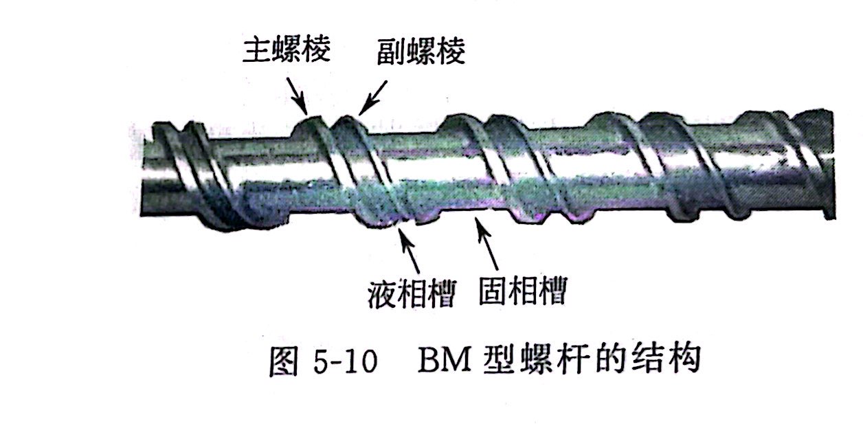 分离型螺杆 分离型螺杆是指在挤出塑化过程中能将螺槽中固体颗粒和塑料熔体相分离的一类螺杆。根据塑料熔体与固体颗粒分离的方式不同,分离型螺杆又分为BM螺杆、Barr螺杆和熔体槽螺杆等。图5-10所示为BM型螺杆的结构,这种螺杆的加料段和均化段与普通螺杆的结构相似,不同的是在熔融段增加了一条起屏障作用的附加螺棱(简称副螺棱),其外径小于主螺棱,这两条螺棱把原来一条螺棱形成的螺槽分成两个螺槽以达到固液分离的目的。一条螺槽与加料段相通,称为固相槽,其螺槽深度由加料段螺槽深度变化至均化段螺槽深度;另一条螺槽与均化段相通,称为液相槽,其螺槽深度与均化段螺槽深度相等。副螺棱与主螺棱的相交始于加料段末,终于均化段初。