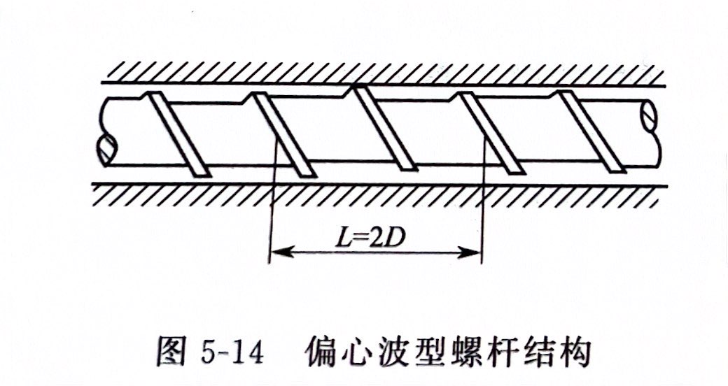 波型螺杆是螺杆螺棱呈波浪状的一类螺杆。常见的是偏心波型螺杆结构,如图5-14所示,它一般设置在普通螺杆原来的熔融段后半部至均化段上。波型段螺槽底圆的圆心不完全在螺杆轴线上,是偏心地按螺旋形移动,因此,螺槽深度沿螺杆轴向改变,并以2D的轴向周期出现,槽底呈波浪形,所以称为偏心波状螺杆。物料在螺槽深度呈周期性变化的流道中流动,通过波峰时受到强烈的挤压和剪切,得到由机械功转换来的能量(包括热能),到波谷时,物料又膨胀,使其得到松弛和能量平衡。其结果是加速固体床破碎,促进物料的熔融和均化。
