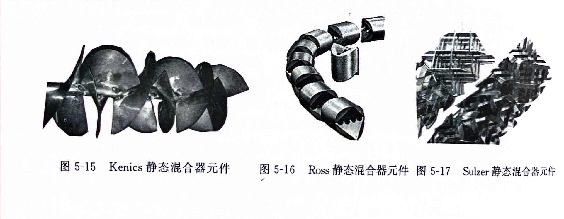 ③ Sulzer静态混合器是由几个以不同方式排列的波状薄片组成的叠层单元放在圆管中构成的,每一叠层单元的相邻薄片的波纹互成90°,其元件结构如图5-17所示。物料进入混合器后,被分割成许多层,而且与其他波状薄片的料流发生混合、转向,以达到均化的目的。