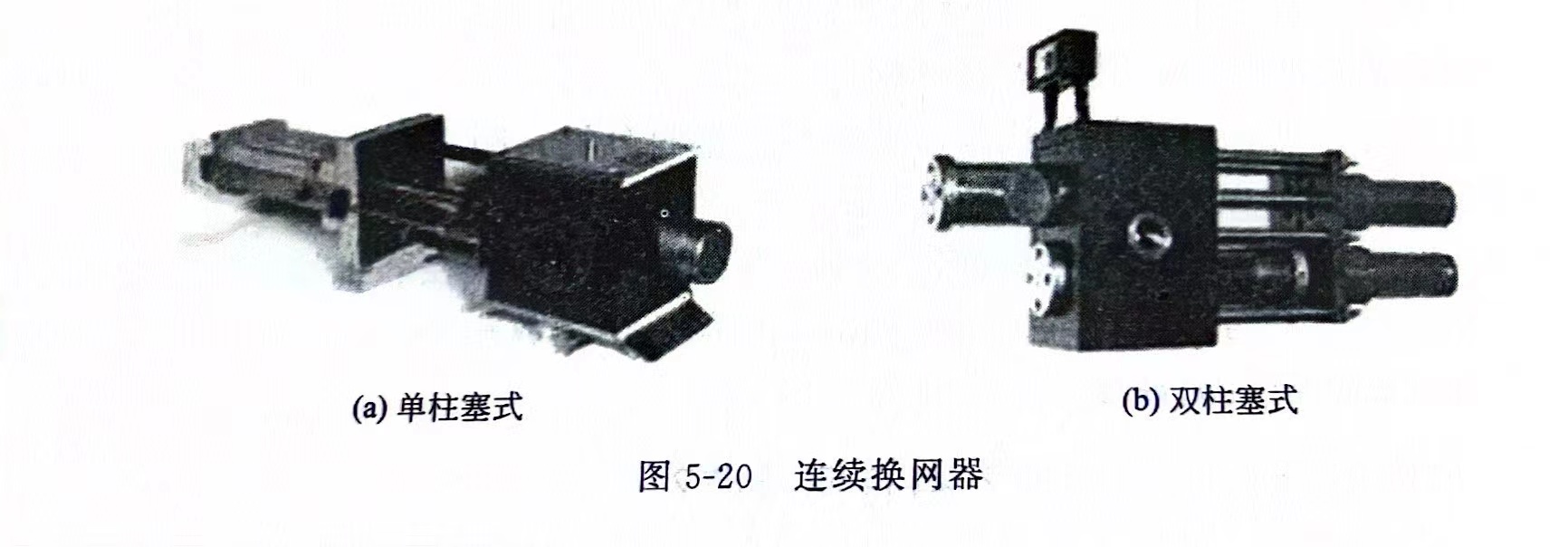 连续换网器 连续换网器的结构形式有单柱塞式和双柱塞式两种形式,其主要组成为换网器驱动装置(液压驱动装置)及换网器本体两部分。结构如图5-20所示。