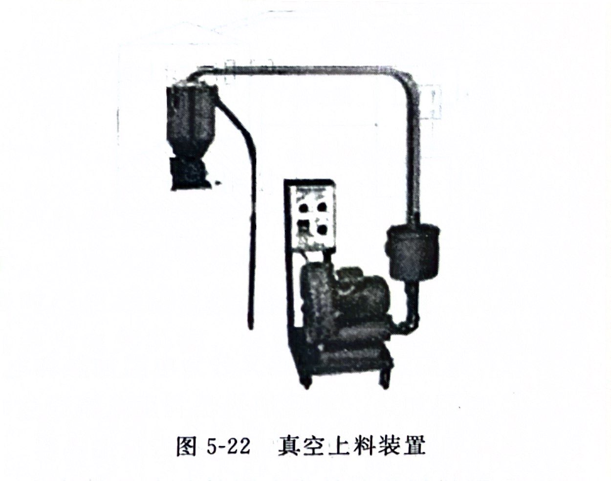 真空上料装置是通过真空泵使料斗内形成真空,使物料通过进料管进入料斗,如图5-22所示。真空泵可以除去在物料中的空气和湿气,以保证管材质量。可适用于粉料和粒料的上料。一般加工PA类等吸湿性较大的物料以及水分、挥发分含量较大的物料时,多选用真空上料装置。