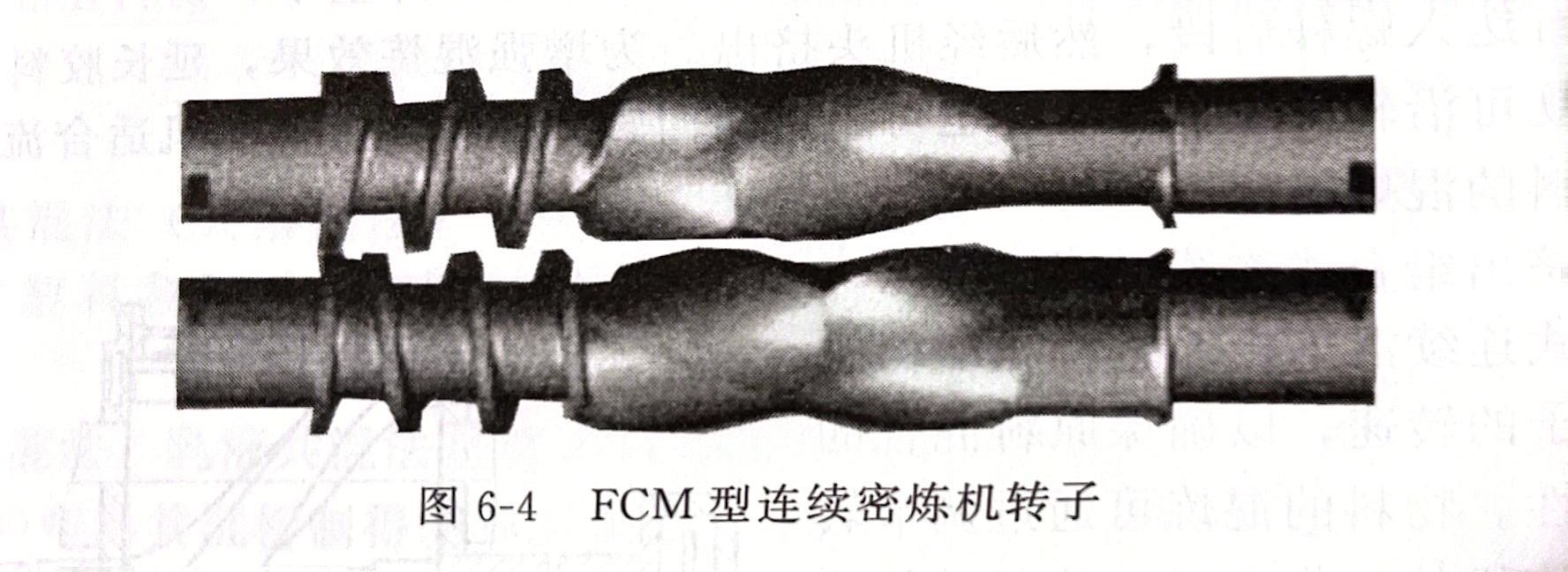 FCM型连续密炼机工作原理 在连续密炼机体内有两个平行相切的转子,向内做相向旋转,如图6-4所示。转子工作部分由喂料段、混炼段和出料段组成。物料自加料口进入喂料段,由喂料段输送到混炼段。混炼段的转子结构和工作原理同普通密炼机相似,物料在这里受到转子与密炼室壁间的强力剪切、转子与转子间的捏合以及转子的轴向搅拌作用,达到良好的混炼效果。通过调节加料速度、转子转速、排料口开度的大小和机筒温度,可控制物料在混炼段内的停留时间与塑化程度。