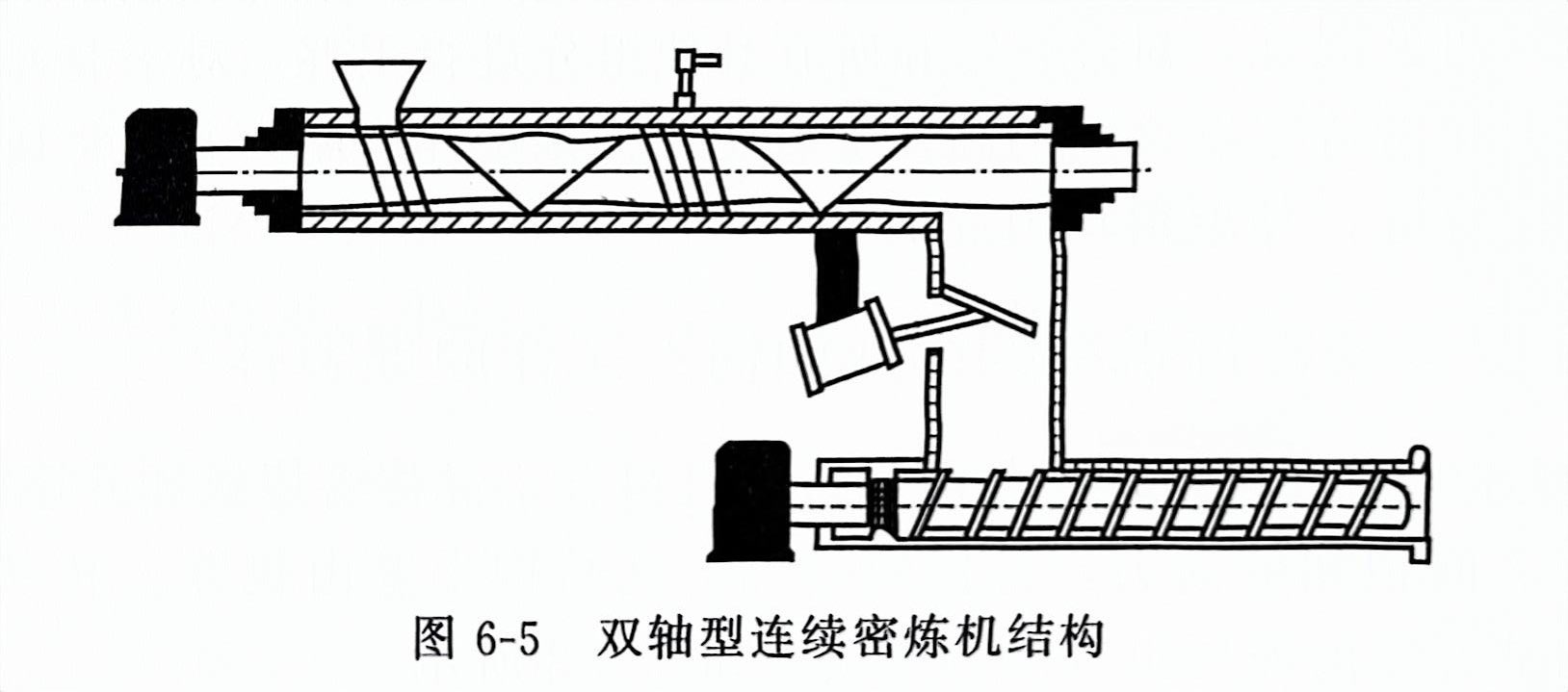 双轴型连续密炼机结构组成 双轴型连续密炼机主要由前混炼段、后混炼段和连接段等三个功能段组成,进料口通常设置在前混炼段的最前端,以便使物料能够得到充分的混炼。前混炼段的最末端有出料口,通过连接部分和后混炼段进行连接,如图6-5所示。