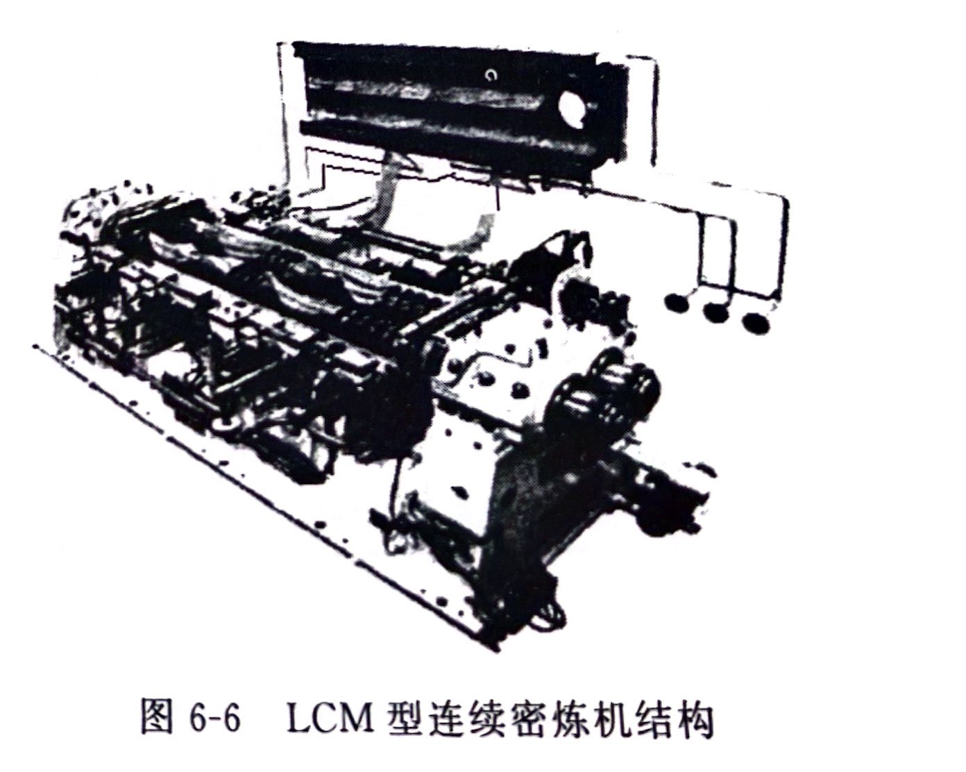 Lcm型连续密炼机结构如图6-6所示,主要由机筒、转子、密封装置和卸料装置等组成,机筒具有冷却水孔,表面有电加热片,以便实时控制混炼温度。LCM的混炼腔相互贯通,横截面形状为"∞"型。物料在混炼腔中受到剪切、挤压、捏合和混合作用。转子的加料段是非啮合的,类似于挤出机的两根螺杆,物料从加料口进入后,在加料段螺纹的输送下,到达转子混炼段。混炼段的转子表面由两对旋向相反、导程不同的螺纹组成。由加料段输送而来的物料在混炼段熔融、混合及塑化。物料在混炼腔中的停留时间可通过调节卸料装置的卸料门的开启度来加以控制。