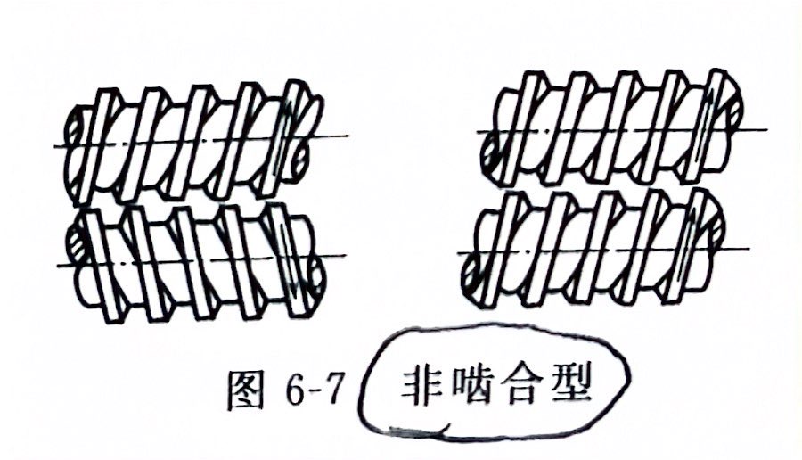 平行双螺杆又分为共轭螺杆和非共轭螺杆。共轭螺杆是两螺杆全啮合,而且其中一根螺杆的螺棱与另一根螺杆的螺槽具有完全相同的几何形状和尺寸,且两者能紧密地配合在一起,只有很小的制造和装配间隙时,称之为共轭螺杆。两根螺杆的螺棱与螺槽间存在较大的配合间隙时称为非共轭螺杆。