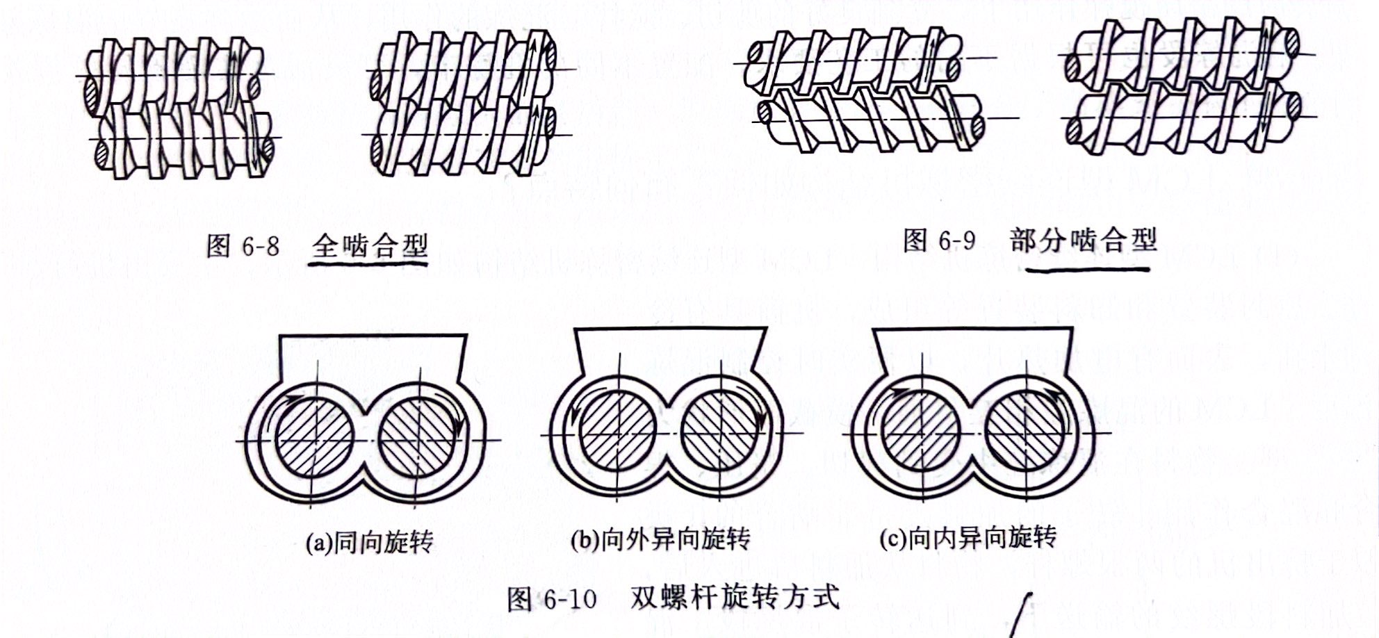 根据相对旋转方向分类分为致,因此两根螺杆的几何形状、向旋转型和异向旋转型。同向旋转型的双螺杆旋转方向一螺棱旋向完全相同,如图6-10(a)所示。异向旋转型的两根传双螺杆又分为向外异向旋转和向内异向螺杆的几何形状对称,螺棱旋向完全相反。异向旋转旋转,如图6-10(b)和(c)所示