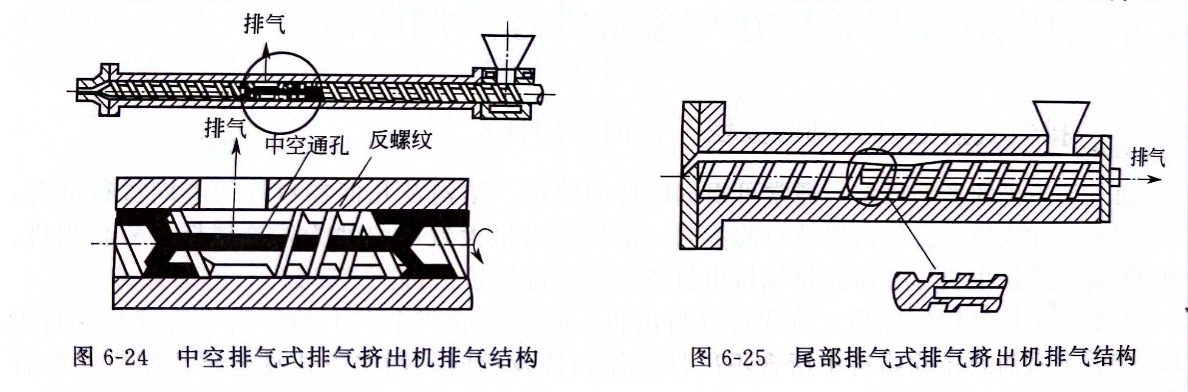 中空排气式排气挤出机是在旁路式排气挤出机上的改进,其结构特点是在螺杆的第一计量段后面设一小段反螺纹,在第一计量段结束处还在螺杆上开设一段与第二阶螺杆相通的中心通孔(代替原来的旁路通道)。熔体通过时,在反螺纹的作用下,迫使其从螺杆中心孔中流到第二阶螺杆,而溢出的气体却可以通过反螺纹到达排气段后而排出,脱除了气体的物料经压缩和塑化后从机头挤出,其结构如图6-24所示。此类排气挤出机一般适用于大直径螺杆挤出机,小直径螺杆会使螺杆的冷却长度受到限制。螺杆结构比较复杂,不易于加工热敏性塑料。