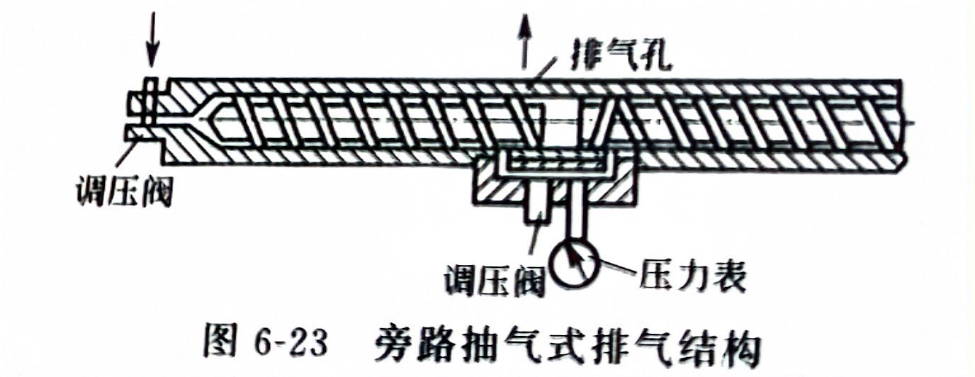 旁路抽气式排气挤出机是在料筒上开设一旁路系统,并安设调压阀,以控制流量;在螺杆的第一计量段末再设置一小段反螺纹,以迫使物料从旁路进入排气段。其设计目的是控制流量,以防止排气段的冒料,旁路抽气式排气结构如图6-23所示。旁路抽气式排气挤出机料筒形状复杂,热处理加工时容易变形,螺杆上的反螺纹段加工也较困难,旁路结构的设置使加热冷却系统装置难于布置。由于旁路的流道复杂,物料易出积滞而产生分解等现象,因此此类形式一般不适于加工热敏性塑料。
