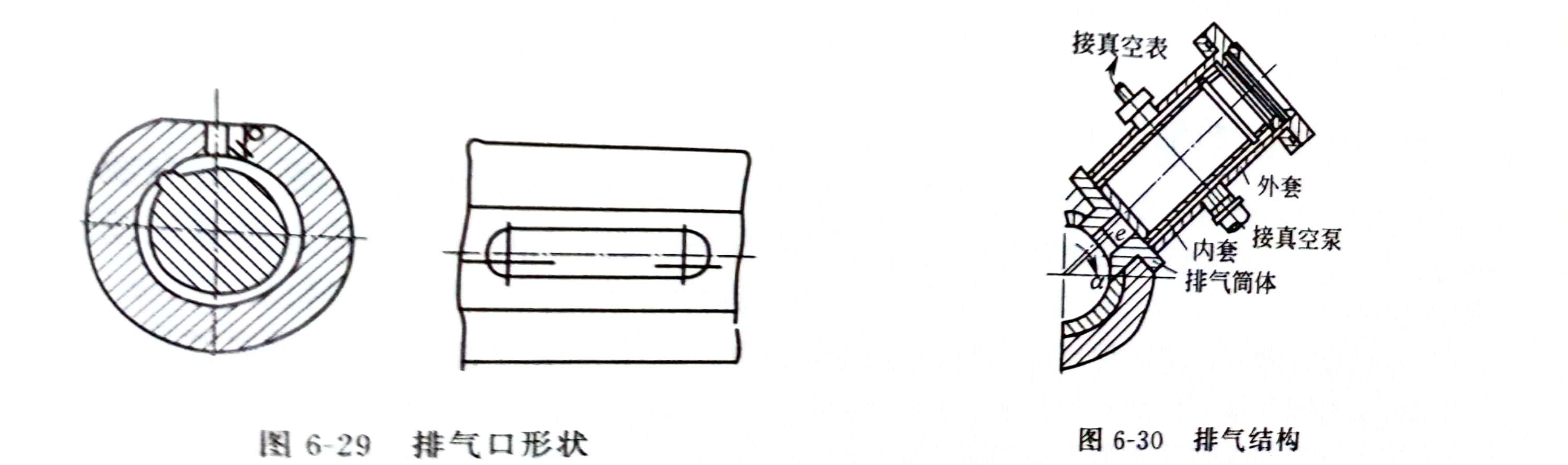 排气口的形状和位置应有利于排气,减少冒料,便于观察和清理,且应加工方便。排气口的形状有圆形、腰子形或长方形等。为长方形时,长边为1D~3D,面积与螺杆截面积之比为0.6~1。排气口的位置可以是向上的,也可以是水平的或倾斜45°,其中心线可稍偏离料筒轴线几个毫米。考虑到物料离开料筒壁进入排气口时的弹性膨胀(巴勒斯效应),在螺杆旋转方向和物料前进方向的料筒壁上加工出一个a=20°的切角,称为吸料角,以避免弹性鼓起的熔体被夹角刮在排气口上累积,堵塞排气口。该角可以将物料拉回,保证排气口干净.