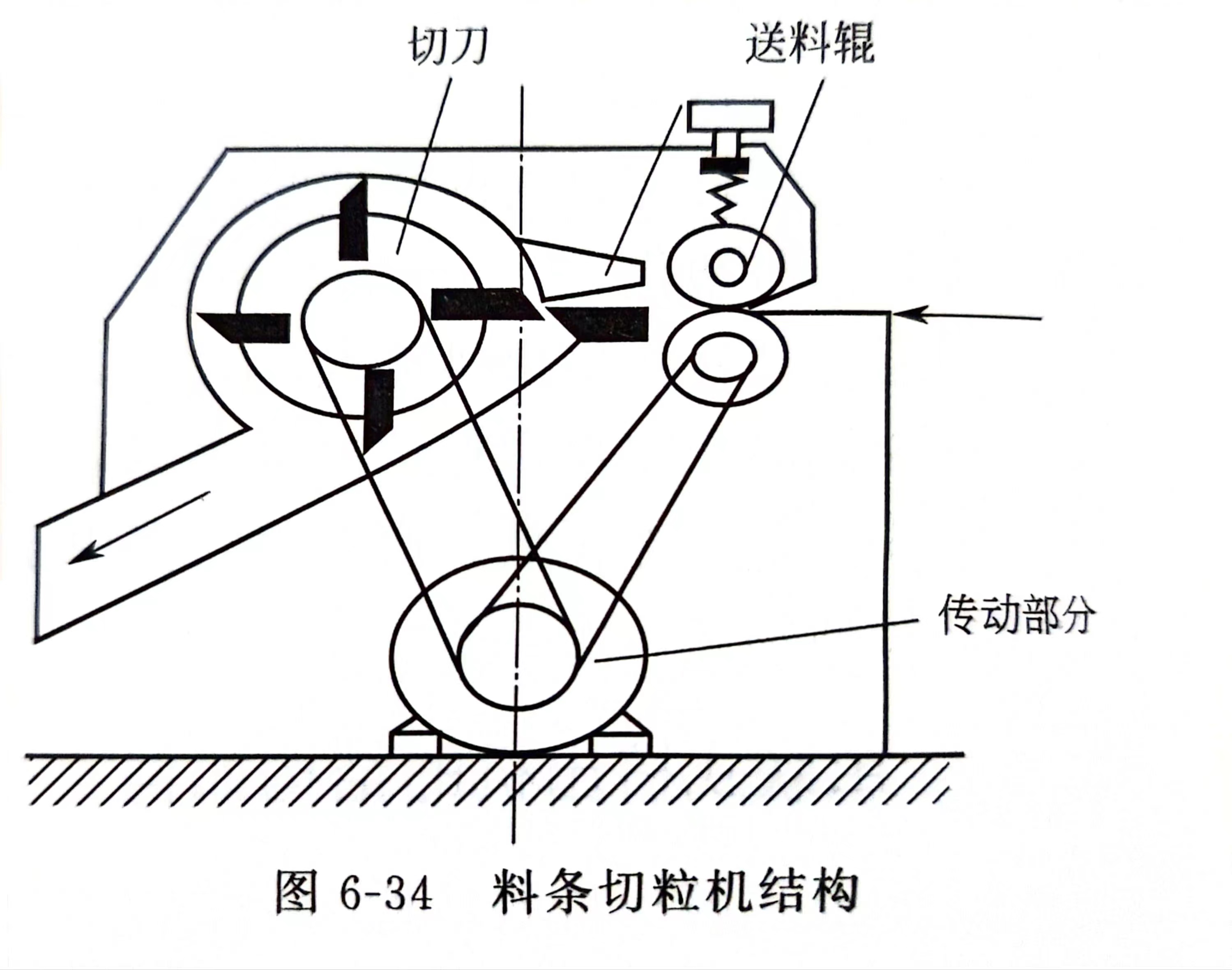 (2)不同类型的特点 料条切粒机的结构组成及切粒流程如图6-34所示,它主要由切刀、送料辊和传动部分等组成。工作时,熔体经条料或带料机头出来后进入水槽冷却,经脱水风干后,通过夹送辊按一定的速度牵引并送到切粒机中,在切刀的作用下,切成一定大小的圆柱粒状料。在切粒过程中,粒料的长度则是由送料辊的速度确定,通常牵引速度不应超过60~70m/min,料条数目不超过40根。这种切粒机一般需与条料机头或带料机头的挤出机配合,料条需用强力吹风机干燥,切粒机具有多把切刀。其操作简单,适合一般的人工操作。