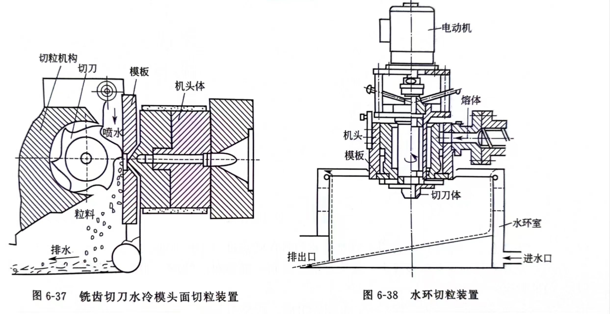 水环切粒装置既可是垂直式又可是水平式的。由于自机头出来的物料能在模头面被切断,切断后的粒料同时已经水冷,故不易产生粘连团。因机头与水直接接触,所以必须考虑密封。为防止切刀与模板间的磨损,模板的表面硬度要求比较高。粒料的形状可以是圆粒状、围棋子状或球状,长度由切刀速度确定,直径由出料孔径来定。其结构如图6-38所示。