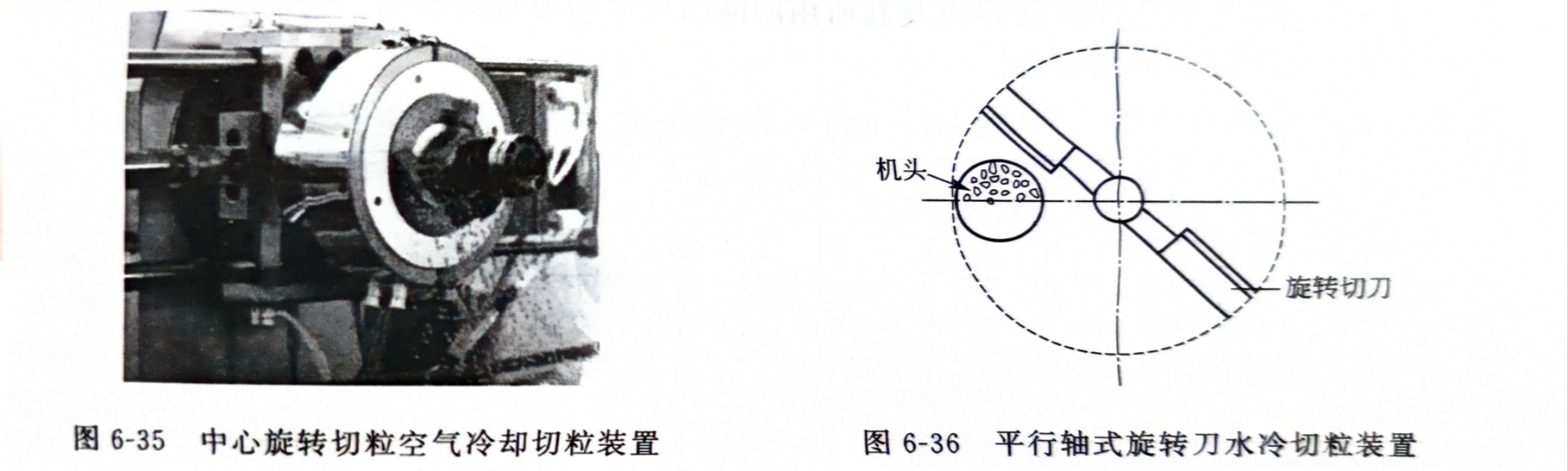 平行轴式旋转刀水冷切粒装置类似中心旋转切刀水冷切粒系统,主要用于聚烯烃的切粒。其结构如图6-36所示。机头中心与旋转刀的轴心不同轴,互相平行。机头板较简单,在一个很小的横截面上可分布很多出料孔,出口平面和机头都较小,但切刀的结构要相对大些,且与模头板之间要精确控制一定的间隙。