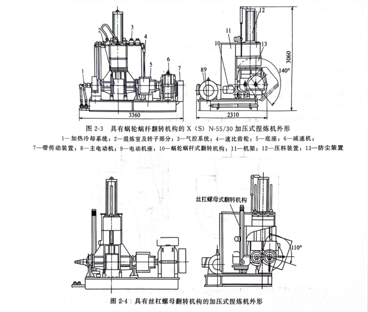 (1)总体结构 加压式捏炼机的总体结构如图2-3及图2-4所示。该机主要由压料装置、炼部件、主传动系统、加料装置、翻转机构、加热冷却系统、气控系统、机架、底座及电控系统等组成。
