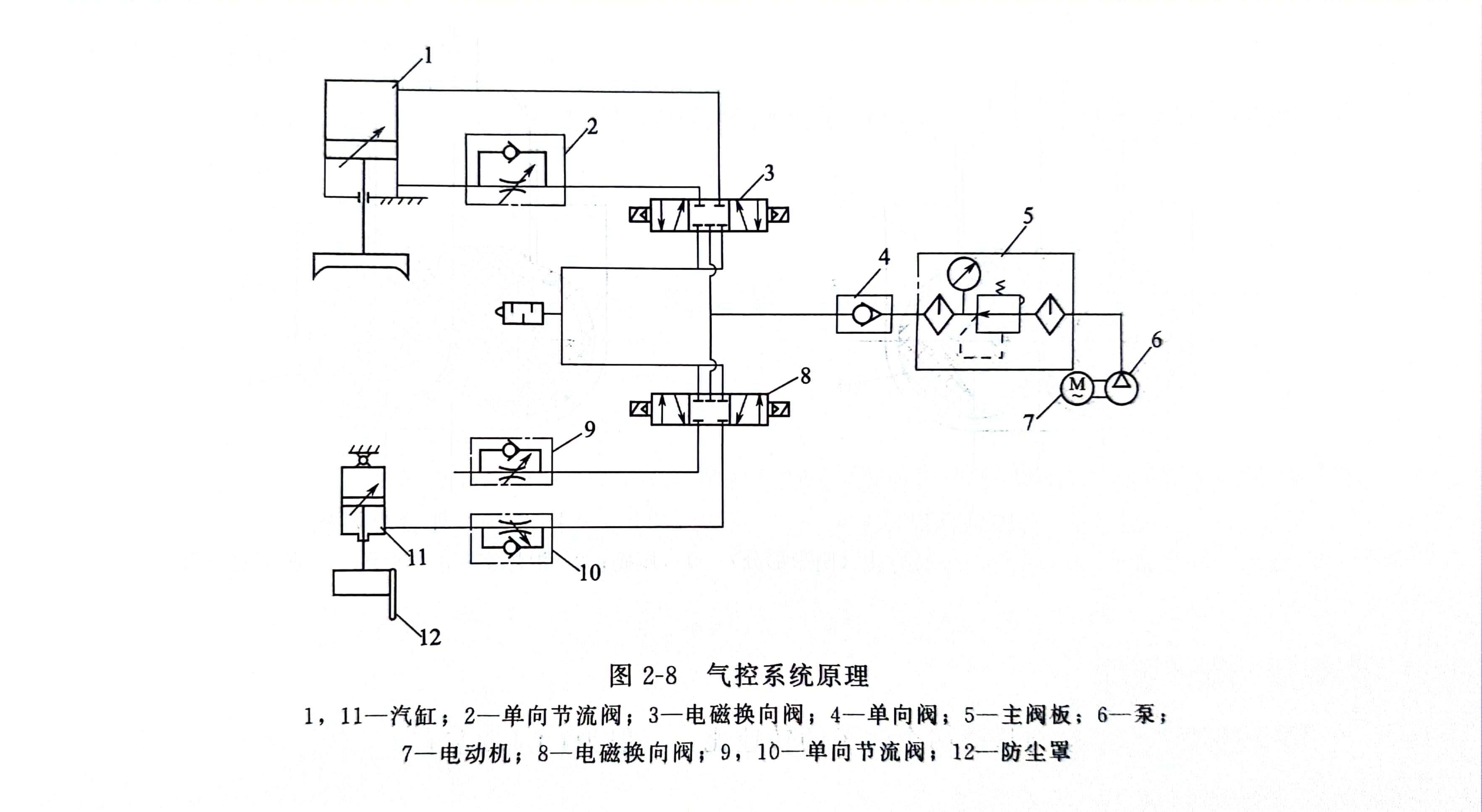 (7)气控系统 气控系统主要由空气过滤器、调压阀、油雾器以及各类阀与压砣加压汽缸及防尘罩汽缸组成回路控制速度以及压力,如图2-8所示。