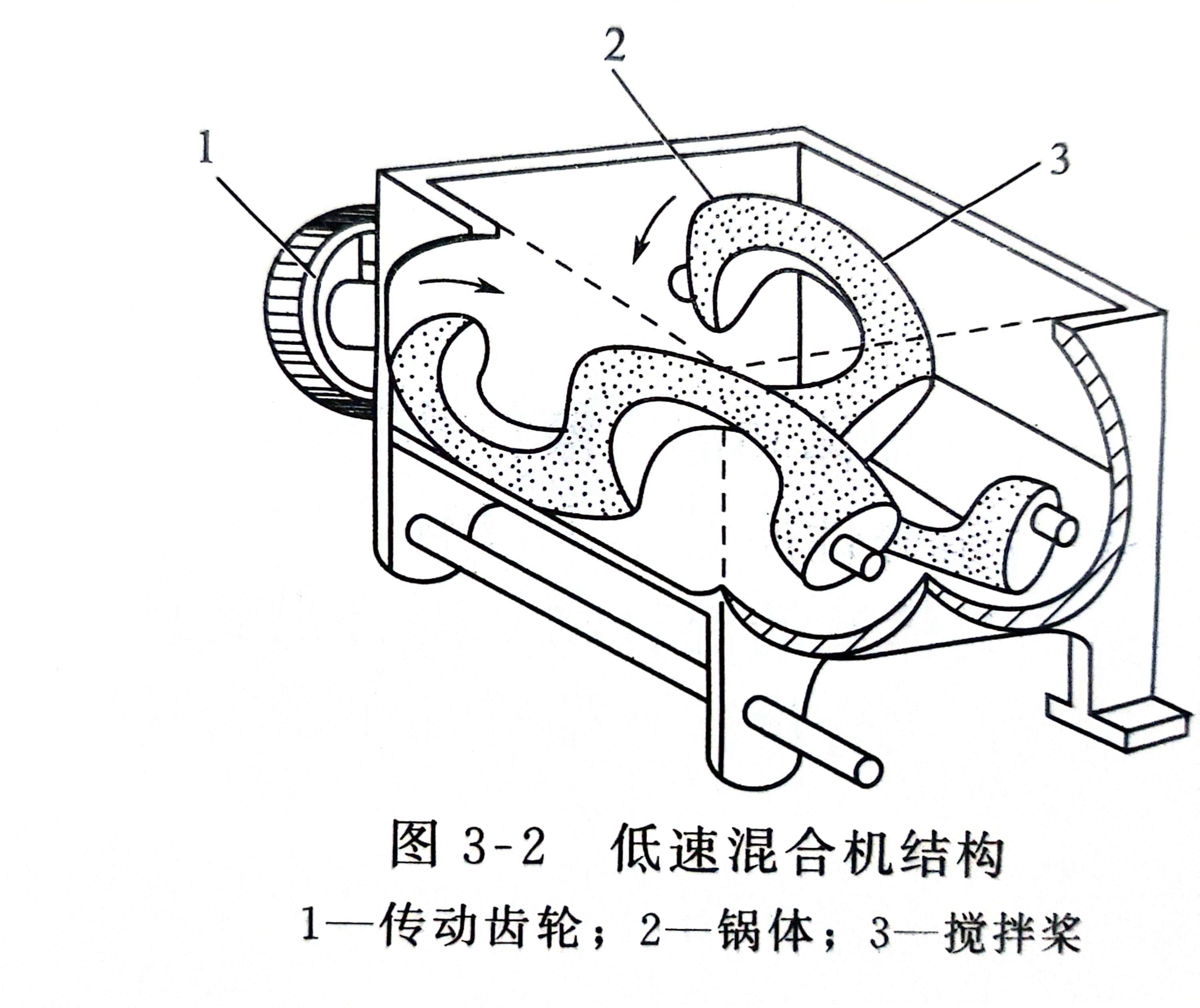 ⑴低速混合机 低速混合机搅拌桨旋转速度低,效率低,除了特殊需要以外,已很少采用。