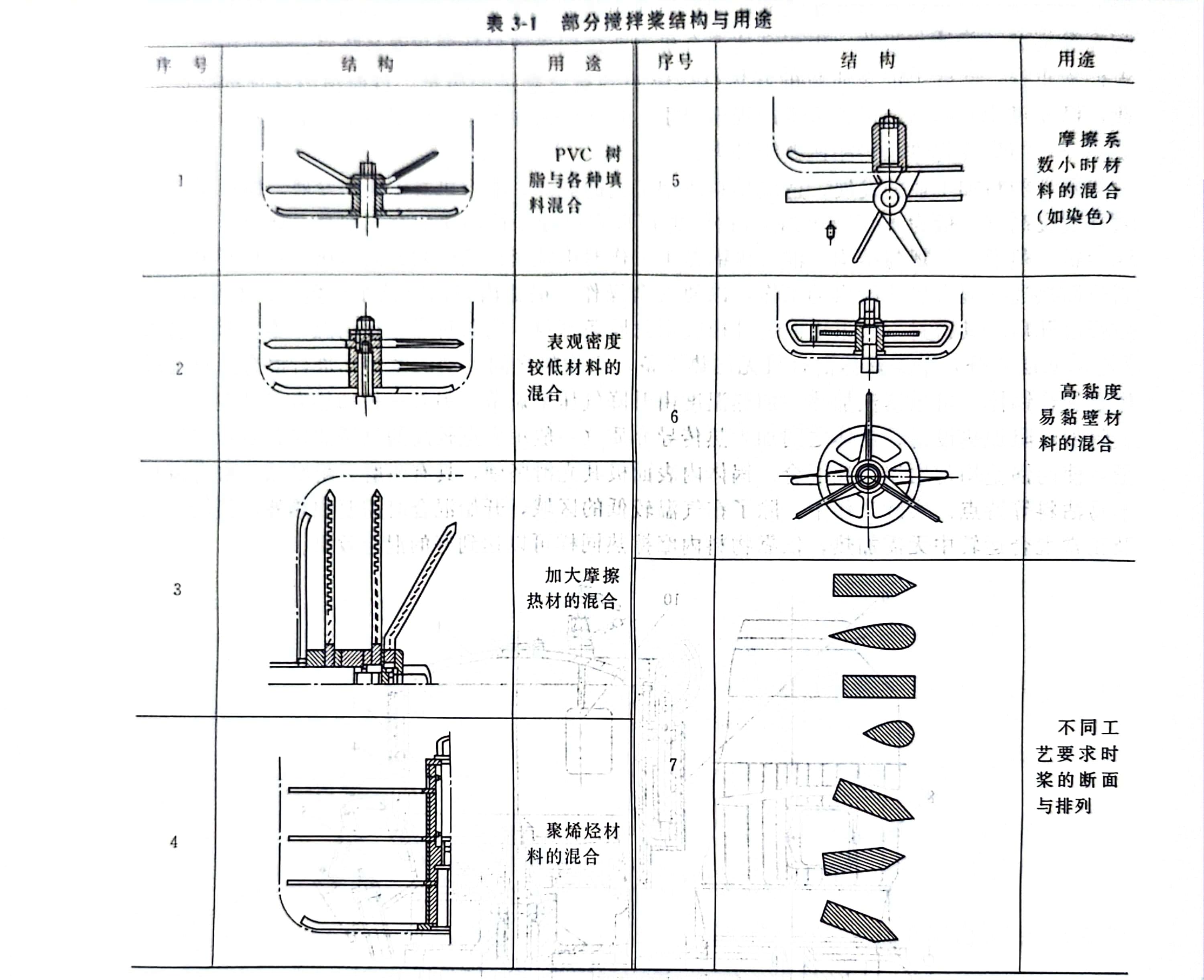 搅拌桨是高速混合机中的重要部件。搅拌桨材质由不锈钢制作,表面经过抛光,表面光滑坚硬,耐磨、耐腐蚀。由于高速混合机不但在塑料加工业中应用,而且在其他加工业中,再生橡胶脱硫、石棉制品、电碳行业、氨基干粉灭火剂、涂料、制药、煤粉、食品及日用化工等各种行业也采用高速搅拌工序,对搅拌桨的形式提出了不同的要求,其结构形式多变.如表3-1所示。