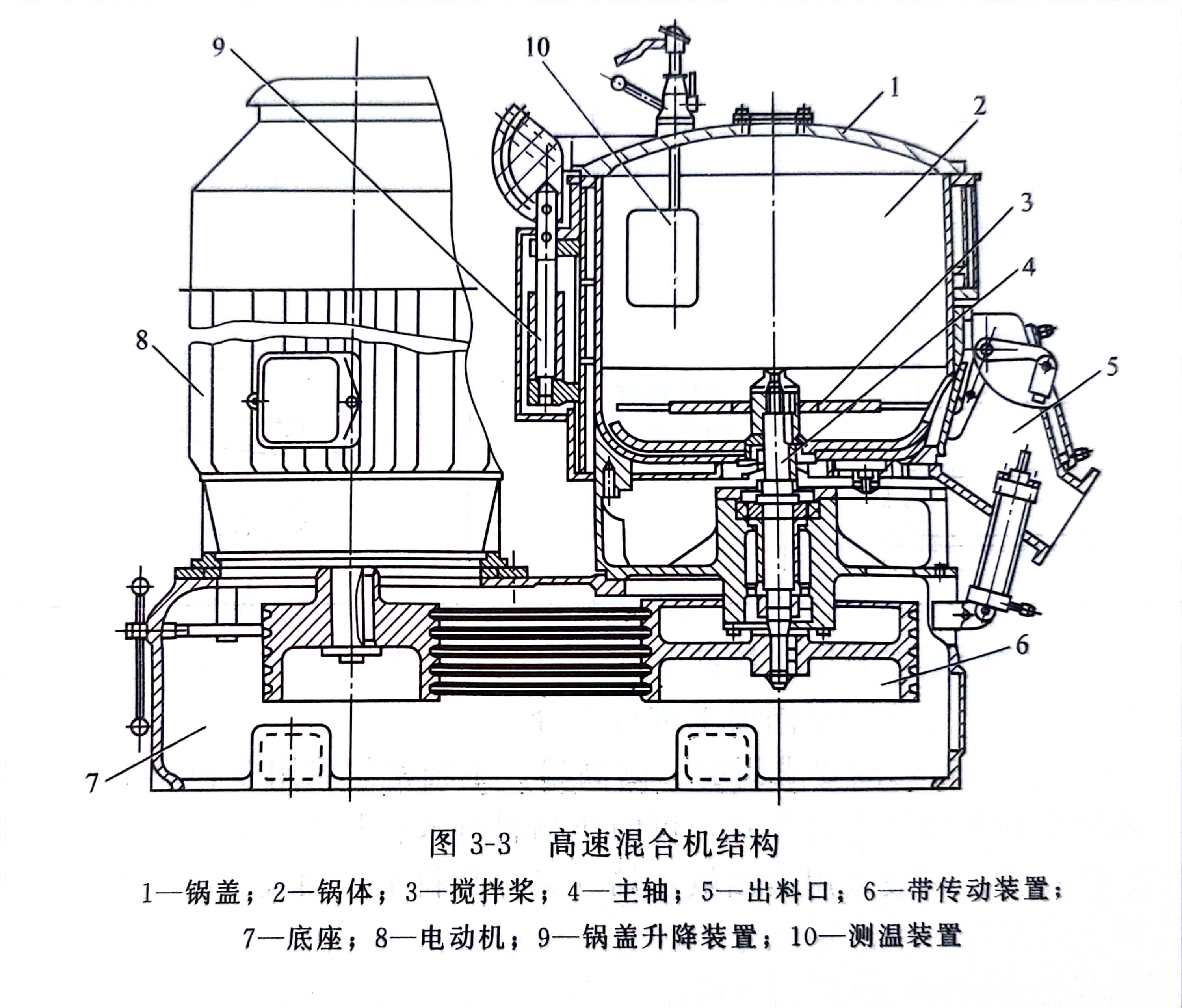 随着塑料加工业的发展,适应塑料成型工艺的需要,混合机有了新的发展、搅拌桨转速大幅度提高(一般为400~2000r/min)。低速混合机逐步被高速混合机取代。图3-3为高速混合机(热混)外观与结构。混合机锅盖1工作时由锁紧螺栓锁紧,同时压下行程开关使控制电路接通,混合机才能启动工作,以便安全操作。锅盖内表面经精车和抛光,不易沾料,质轻易开启。其密封方式采用两道硅橡胶密封胶条密封,密封可靠,耐高温,不变形、锅体2有单双层之分:单层锅体混合机无加热设备,靠物料之间运动的摩擦热进行混合。双层锅体是加热锅体,可用蒸汽加热,加热温度由升降气压来调节。另外一种加热方式是在外锅体上附加电阻加热设备,锅体之间加入热传导介质(一般用燃点较高的机械油作介质)传导热量,使内锅壁均匀增温加速混合。锅体内表面极其光滑坚硬,具有耐磨、耐腐蚀、耐高温和不易沾料等特点。实际工作中,除了在气温较低的区域,开始混合时需要加热外,其他区域及正常混合运转中无需加热,依靠物料内摩擦热同样可以达到好的混合效果。