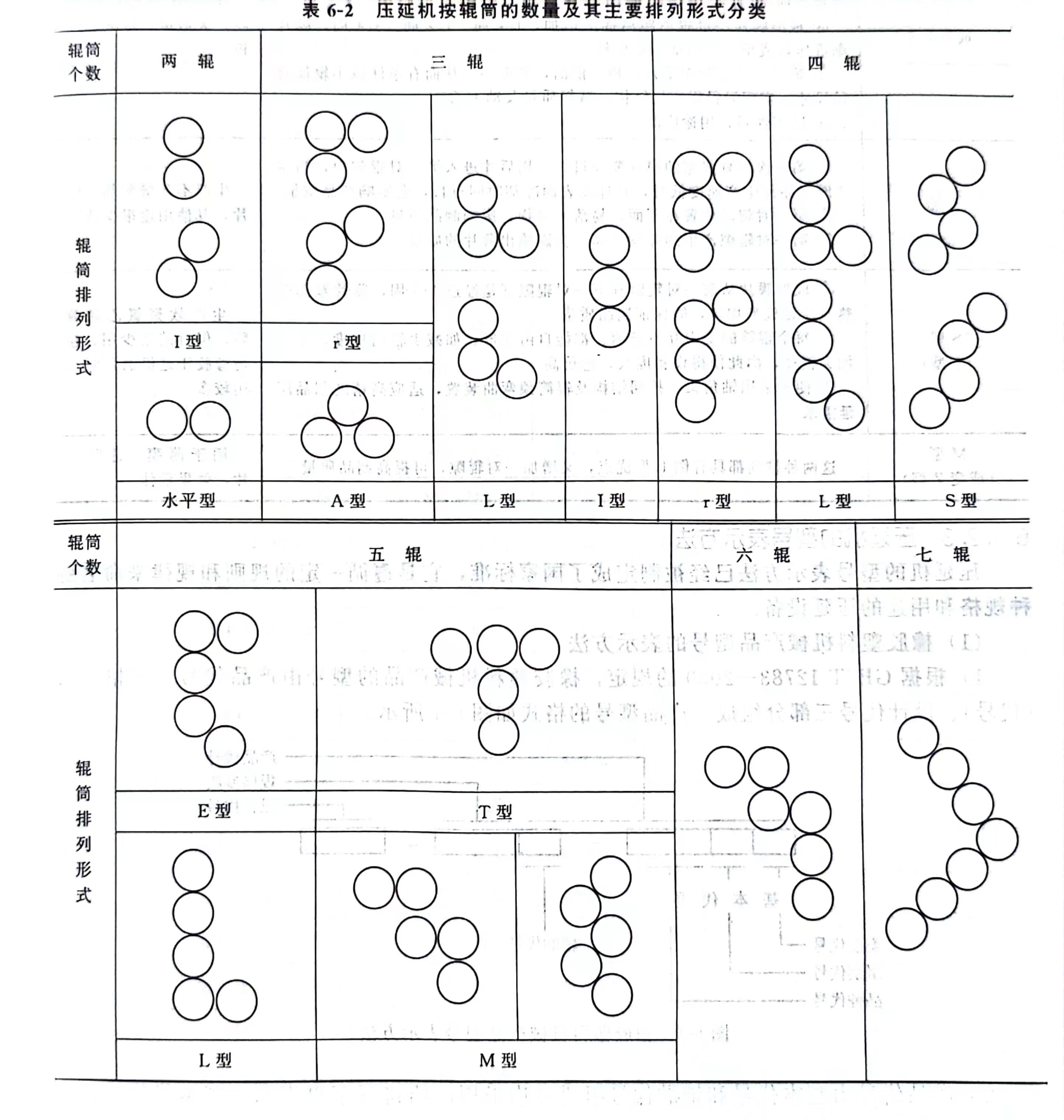 (2)按辊简排列形式可分为1型压延机、r型(旧称工型,又称倒上型或F型)压延机、L型压延机、乙型压延机、斜乙型压延机、S型压延机、△(三角形)型压延机、T型压延机、M型压延机及其他形式的压延机等。