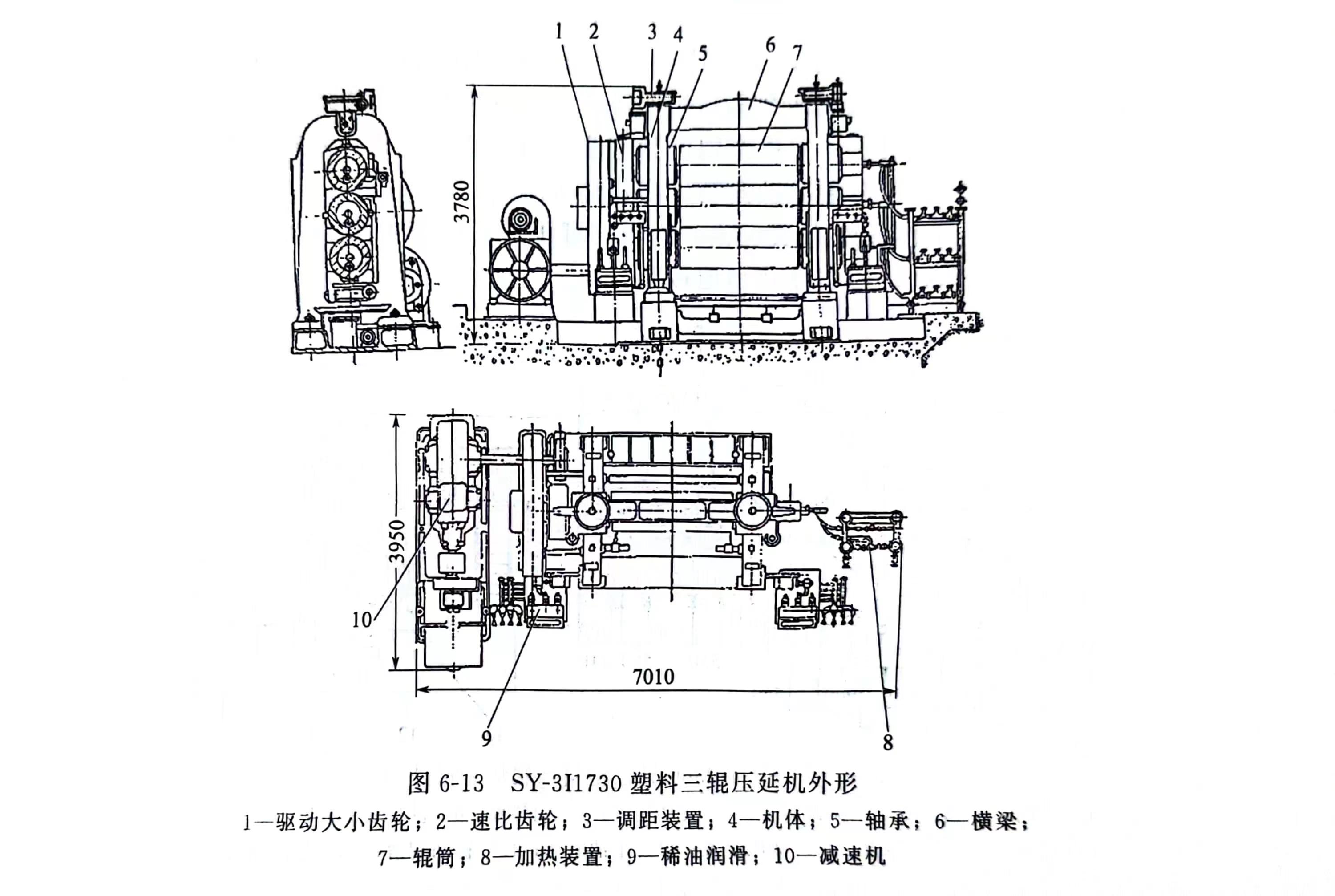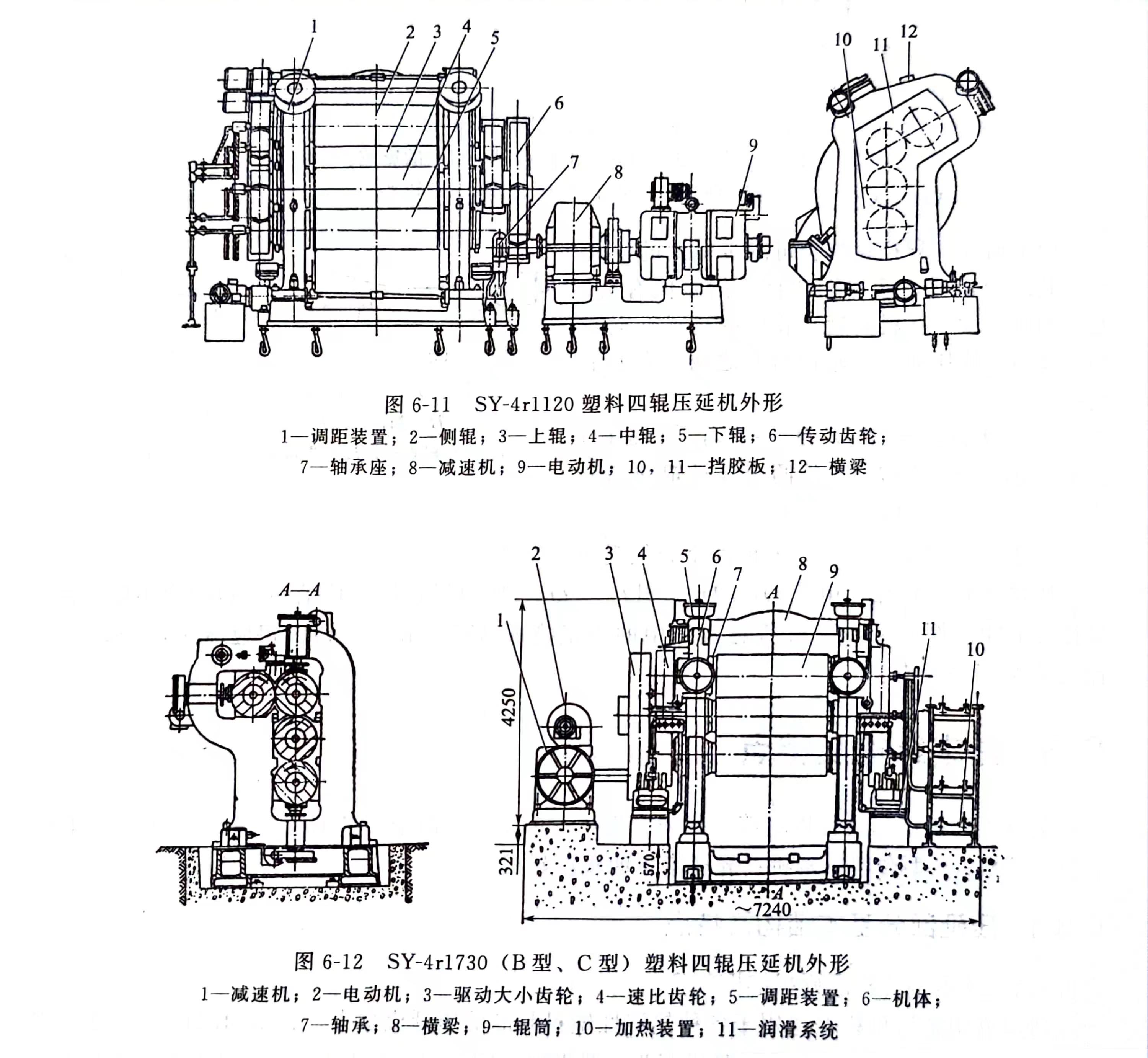 主要结构特点:旧式结构其辊简为中空型,蒸汽加热,滑动轴承,传动以电动机通过减速机、开式齿轮和辊筒速比齿轮来驱动辊筒。此种结构简单、精度低。适用于普通档次的塑料制品压延,操作与维护简便。图6-11为SY-4r1120型,用于生产膜及半硬性塑料或新型的高填充剂塑料片;图6-12为SY-4r1730 B型,多用于生产人造革;SY-4r1730C型多用于瓦楞板的基片;图6-13为SY-311730型,多用于压延聚氯乙烯硬片。