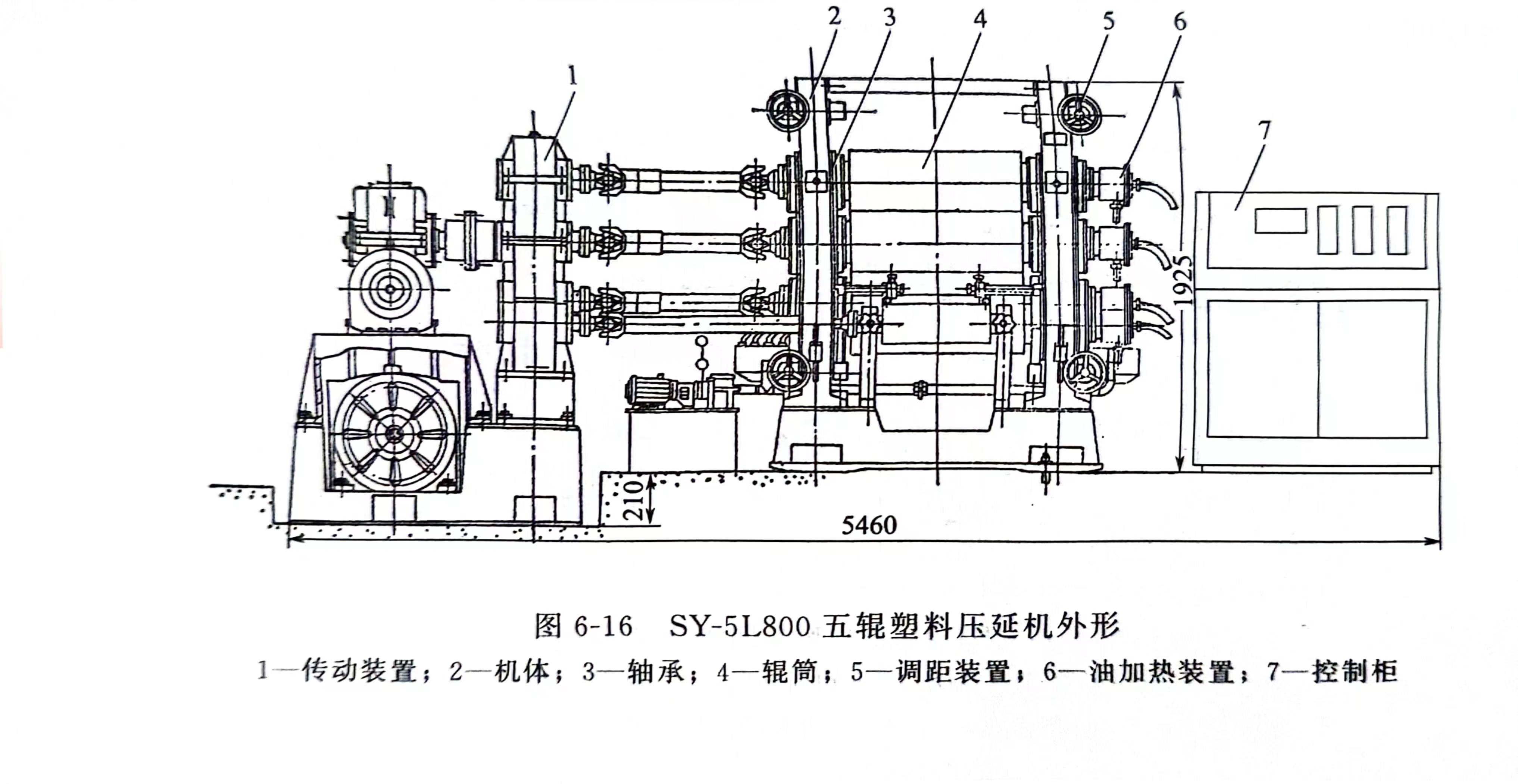 如图6-16所示为SY-5L800五辊塑料压延机。这是各种规格的五辊塑料压延机常用的形式,主要用于压延塑料硬片。结构特点采用集中传动,钻孔辊油加热。辊筒呈L型排列,增加了一道压延间隙有利于塑料硬片的成型、定型和引离,从而提高运行速度和保证制品的质量。