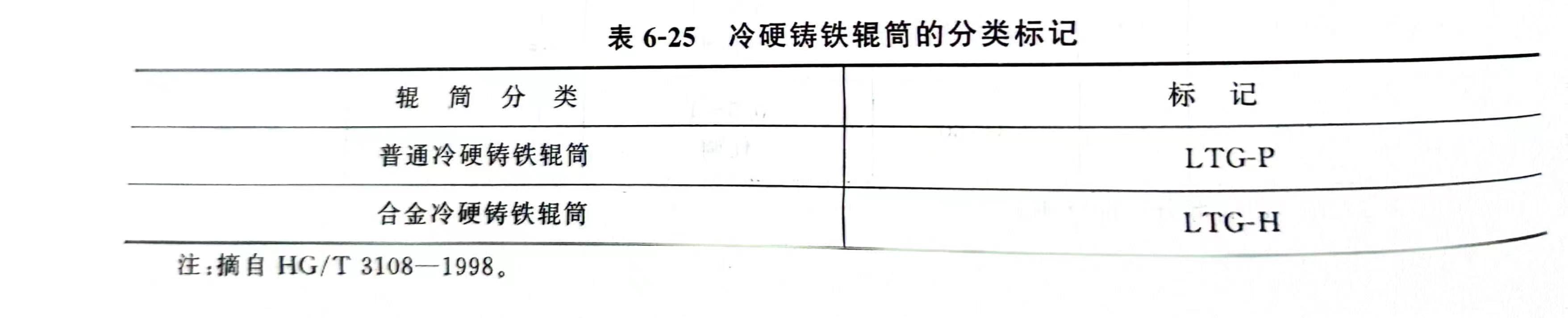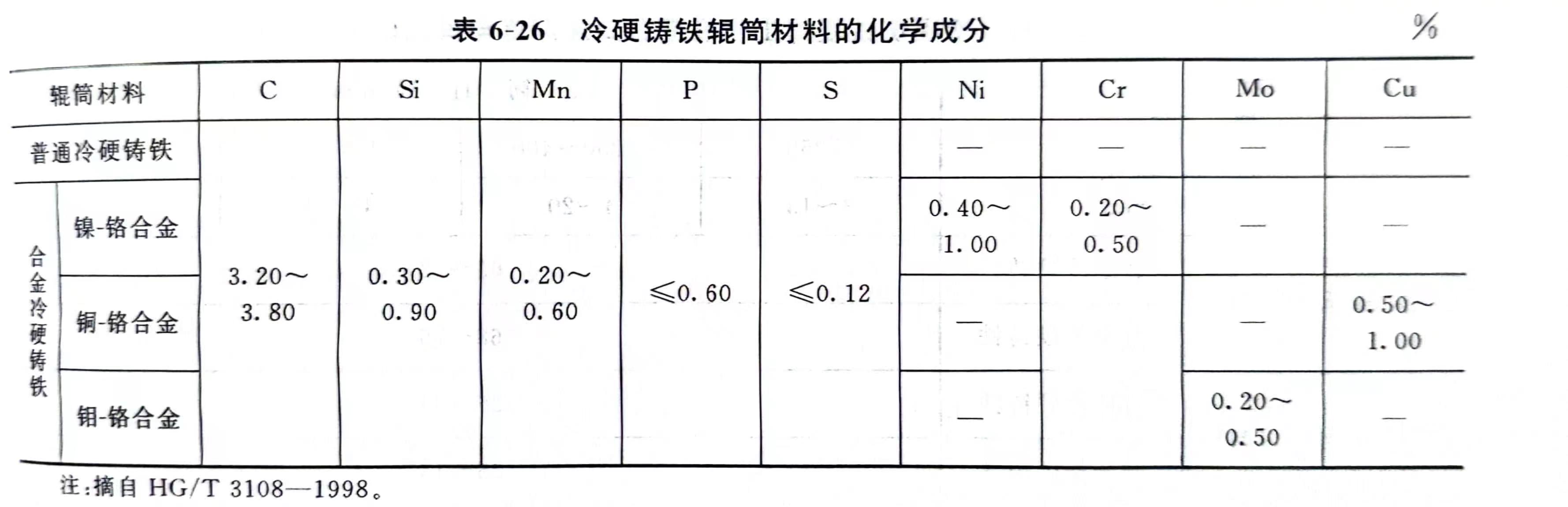 压延机的辊简材料一般采用表面硬度高、芯部有一定韧性和强度的普通冷硬铸铁、合金冷硬铸铁,也可采用铸钢或锻钢(工作表面经硬化处理)及复合材料(工作部位表面为高硬度的合金钢、内部为普通碳钢或外部采用冷硬铸铁、芯部采用球墨铸铁双层浇铸)。国内目前主要采用普通冷硬铸铁和合金冷硬铸铁,其分类标记和材料化学成分见表6-25和表6-26。