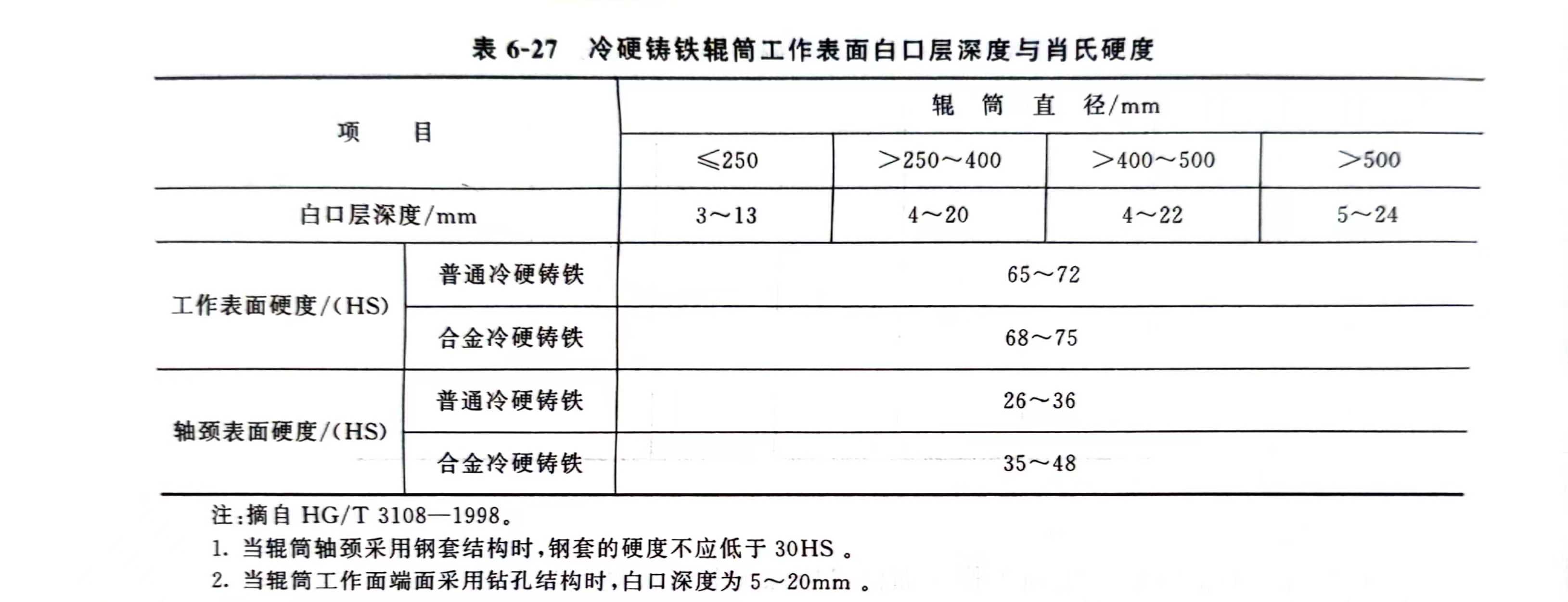 1)经机械加工以后,辊筒工作表面白口层深度和肖氏硬度参见表6-27。