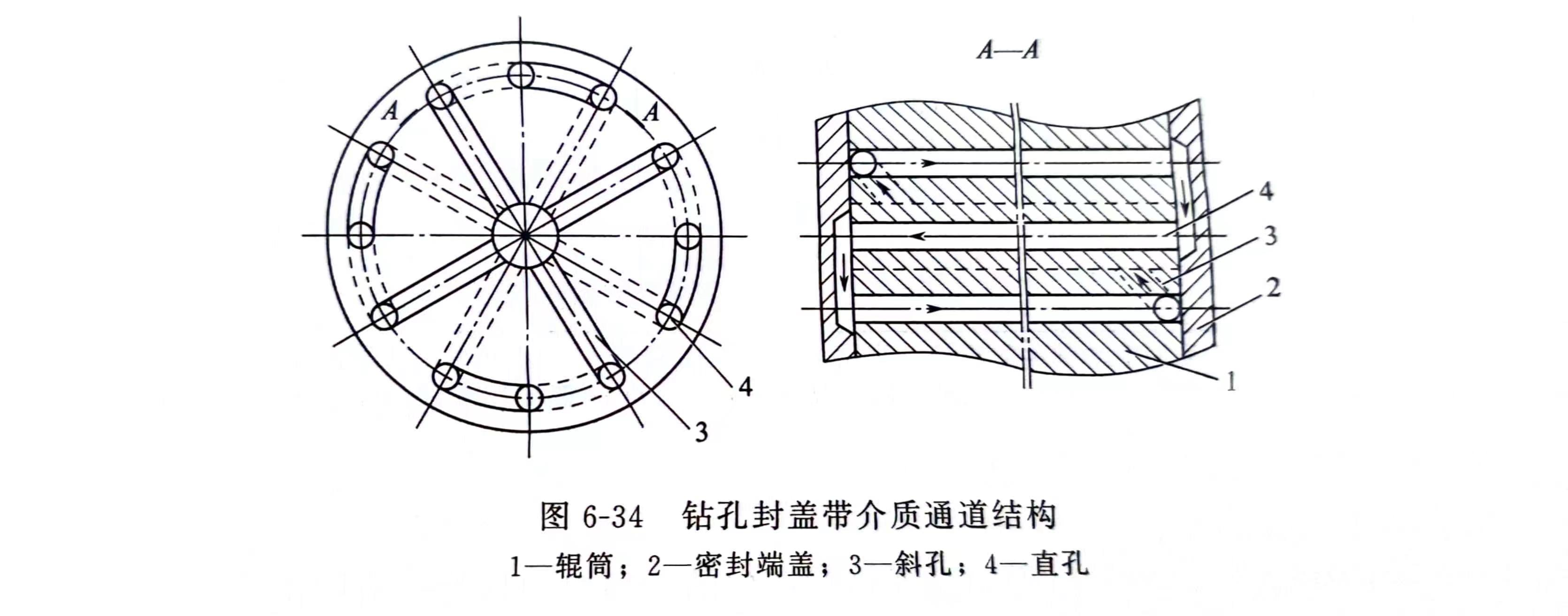 1)在辊简工作表面两端用带有介质循环通道的密封盖挡住,如图6-34所示。该结构制作简便,但由于温控介质在直孔和密封盖之间组成的流道中循环运动时,易使密封盖受压变形,造成泄漏。