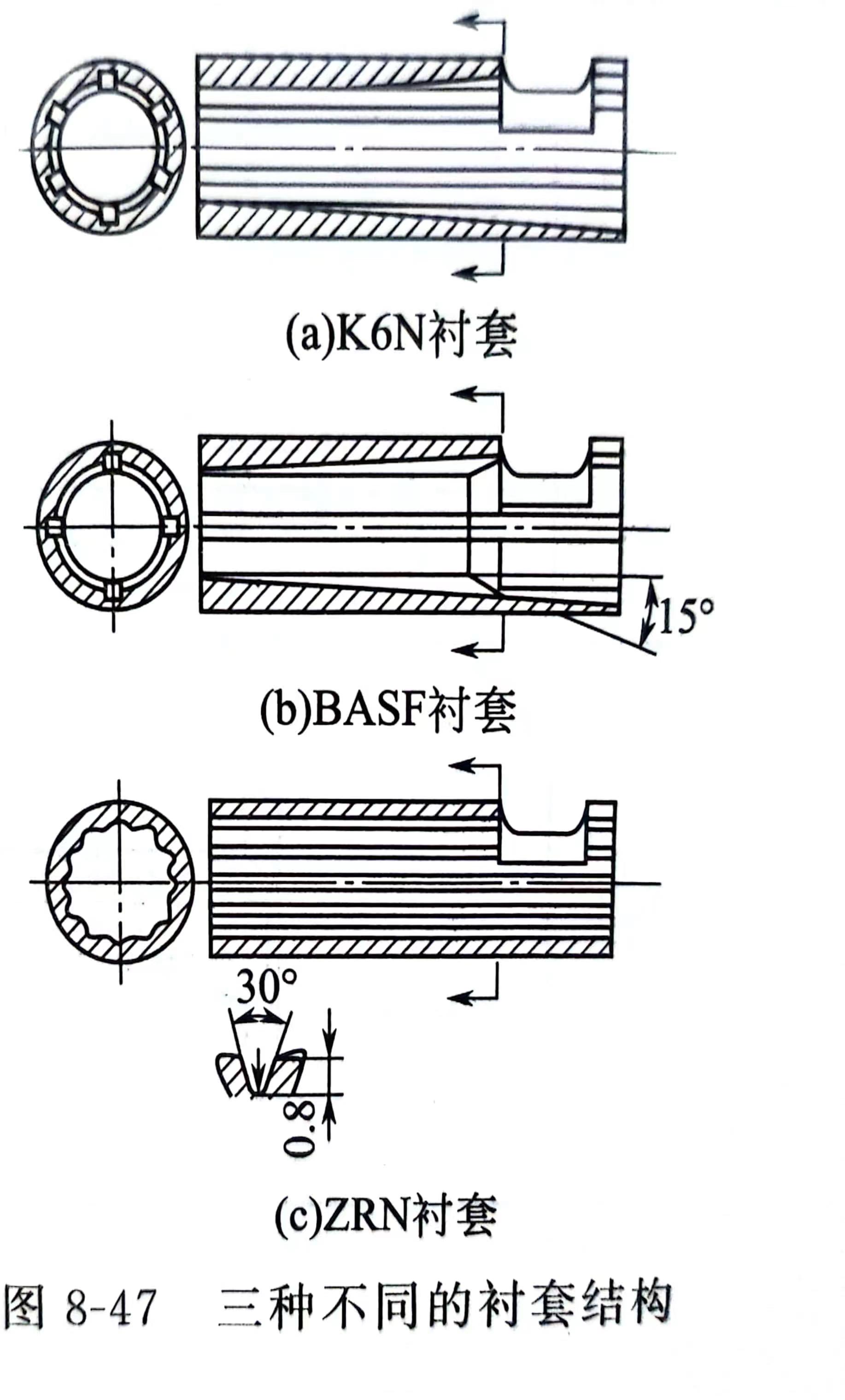 2)衬套的结构形式 图8-47为三种不同的衬套结构形式。其中:K6N衬套[图8-47(a)]带有锥形内孔,有利于增加螺槽中的进料量和尽快将塑料压实;BASF衬套[图8-47(b)]为增大加料口处的进料量,将该处的衬套内径扩大;ZRN衬套[图8-47(c)]的内径不变,其圆柱形内孔表面开设了多条深度较浅的锐角纵向槽,适用于粉料。沟槽的截面形状有矩形、半圆形、锯齿形、三角形和镰刀形等,其中矩形效果最佳、应用最多,其次为锯齿形。
