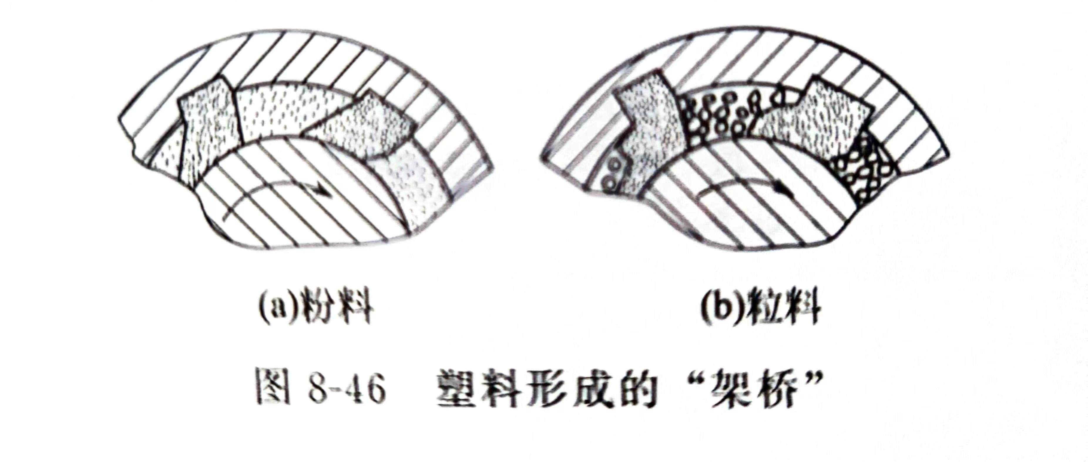 由于衬套内表面开有纵向沟槽,塑料随螺杆转动的趋势受到沟槽侧面的阻挡,其内部形成“架桥”(图8-46),螺槽中的塑料如同带翅螺母一样套在螺杆上。螺杆旋转时,塑料“带翅螺母”便被沿螺杆轴向向前输送。由于塑料的内摩擦系数(塑料与塑料)比外摩擦系数(塑料与金属)大,且开槽的效果相当于大大增加了塑料与机筒之间的摩擦系数,故打滑现象和回流大大减少,从而提高了固体输送效率(达0.6~0.85,光滑机简时仅为0.2~0.4),达到提高挤出机产量的目的。
