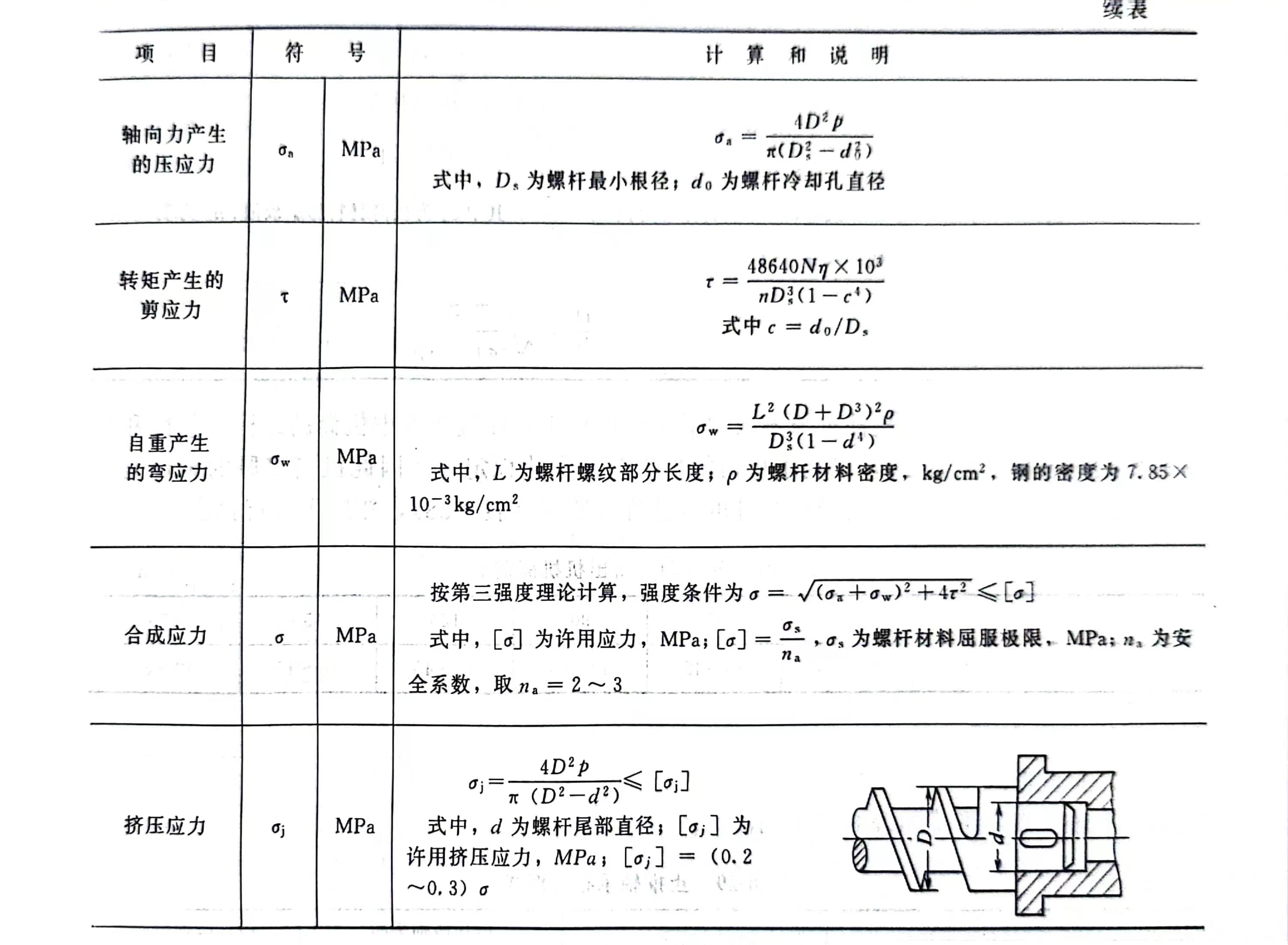 (1)螺杆的受力分析和强度计算 螺杆受力分析如图8-35所示。强度计算如表8-26所示。