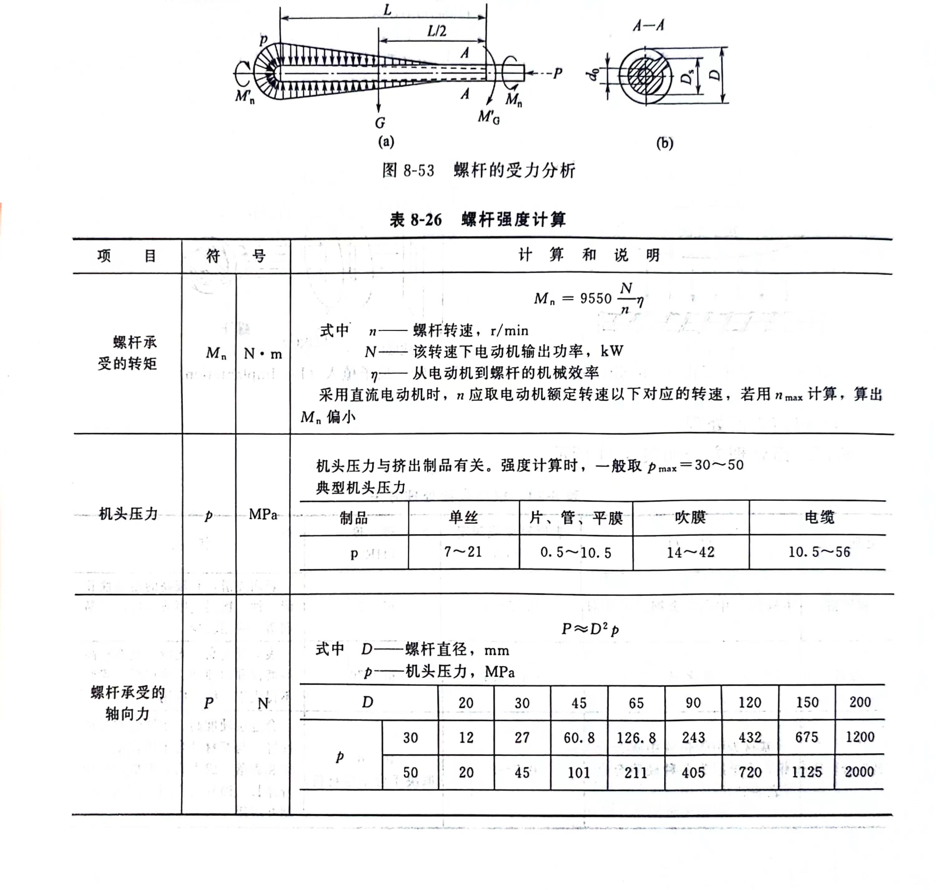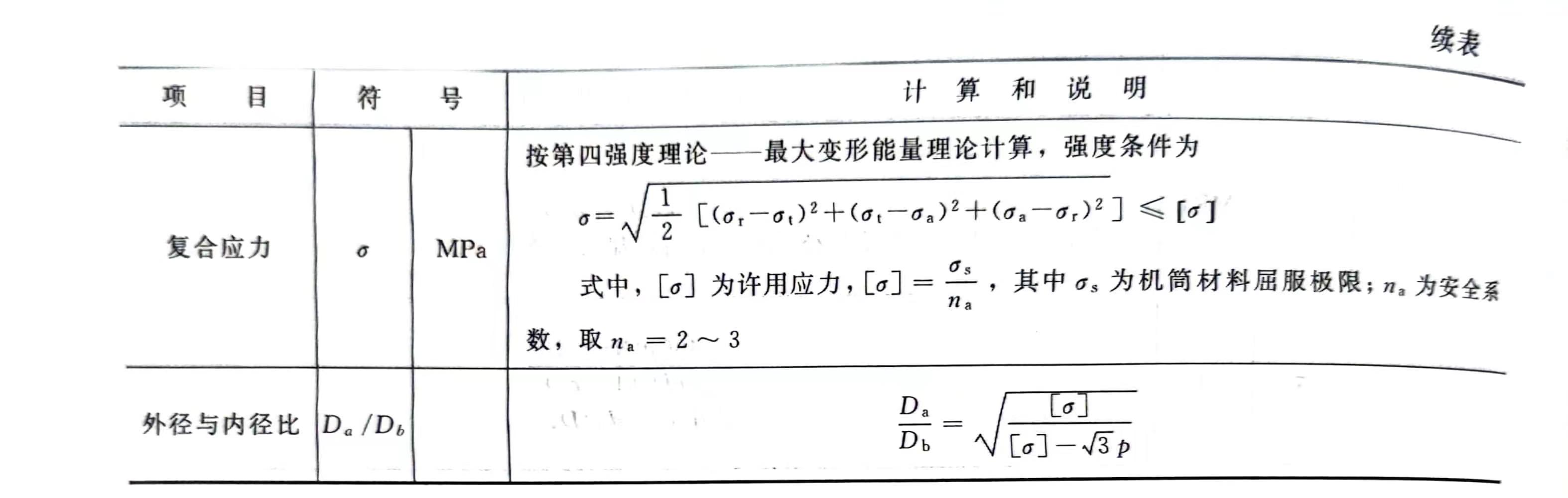 挤出机工作时,机筒内部受塑料压力的作用,压力沿机简轴向分布相当复杂,各处压力不等,故取最大机头压力作为计算压力。由于机筒外径与内径之比Da/Db>1.1,可用厚壁筒理论进行强度计算,机筒壁上每一点都处于三向应力状态,即径向应力ɓ和轴向应力ɓa(图8-54)。其强度如表8-27所示。