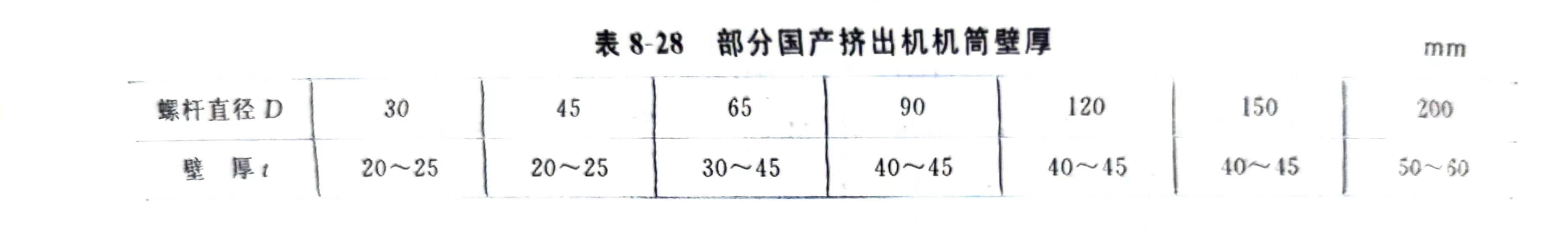 必须要指出的是,决定机筒壁厚不仅要满足强度要求,而且要考虑机筒的结构工艺性和具有必要的热容量(热惯性),以利于机筒的加工制造和热稳定性。因此机筒壁厚的确定是个比较复杂的问题。目前多采用经验统计的方法确定壁厚(表8-28),然后再进行强度校核。