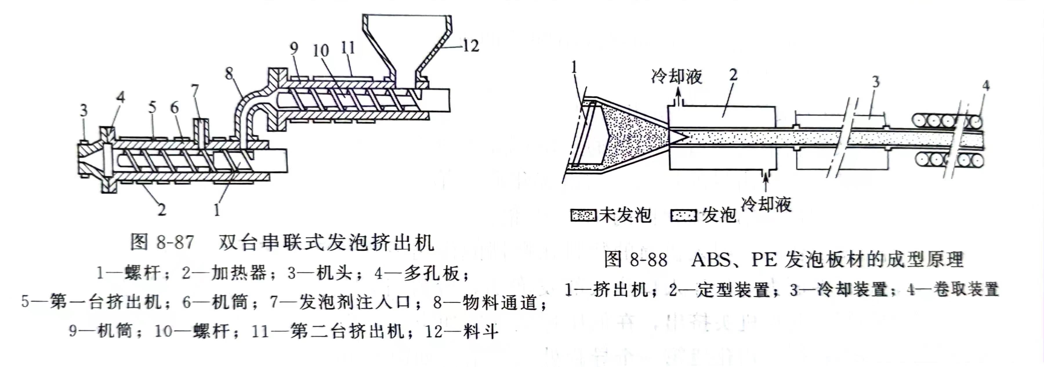 图8-88表示了ABS、PE发泡板材的成型原理,它既可进行高倍率(20~80倍)的发泡成型,又可进行低倍率(1.5~8倍)的发泡成型,还可进行复合发泡成型,即表面为木纹的低发泡倍率的硬膜,而内部为高发泡倍率的板材。这种复合材料作为建材及装潢材料得到较广泛的应用。