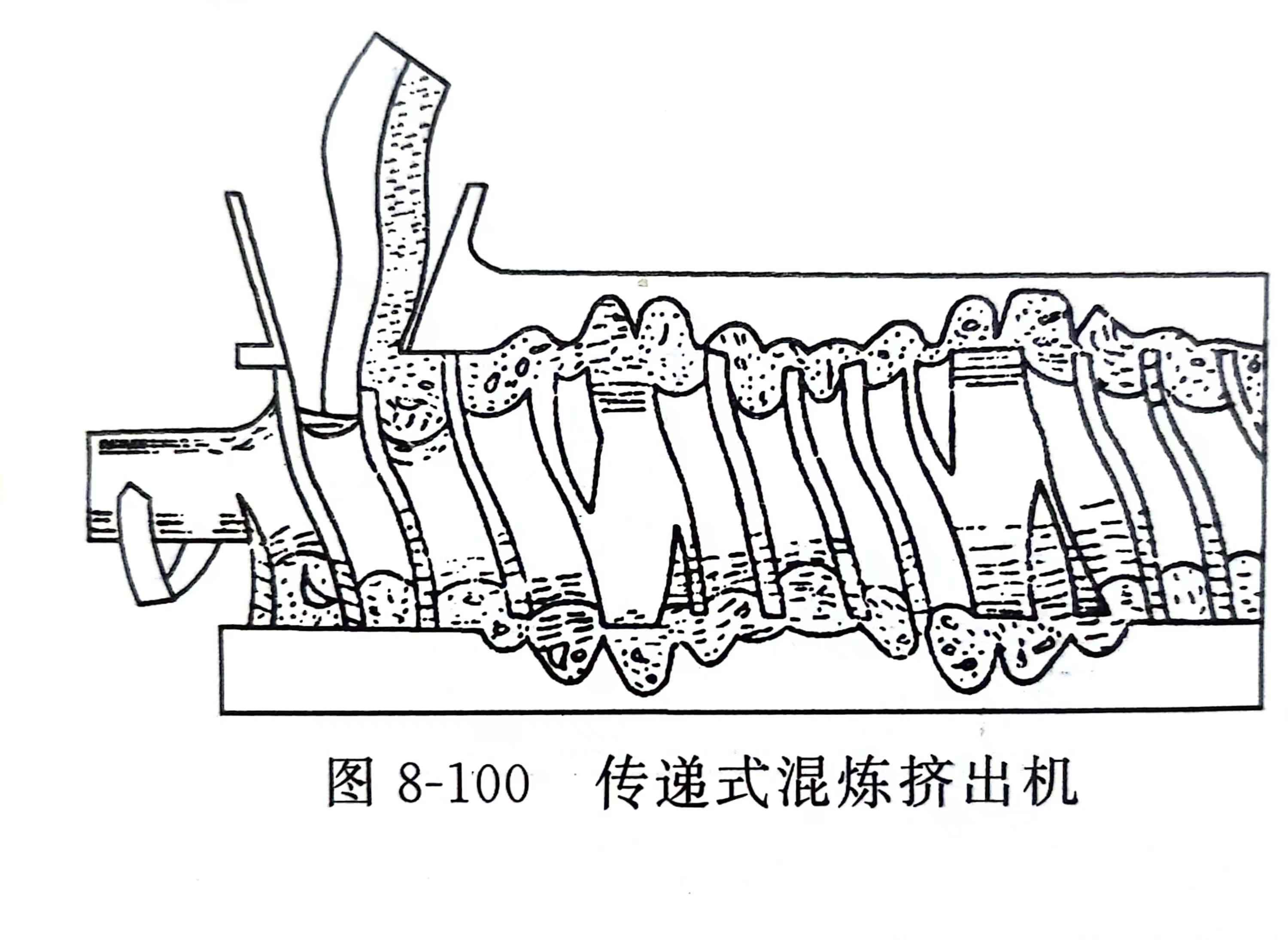 传递式混炼挤出机的螺杆和机筒都开有螺旋槽。如图8-100所示,螺杆上的第一段螺槽深度是由深渐变到浅乃至无槽,而在与其对应的机筒内壁上开设螺槽深度的变化则正相反,而是由浅渐渐变至深。而且螺槽的旋向也与螺杆相反。第二段螺槽深度的变化与第一段相反螺杆上的槽深是由浅到深,而机筒上的螺槽则是由深到浅乃至无槽,整个螺杆和机筒系统有2~4个这样的变化区段。这种混炼挤出机一般都设有柱塞式强制加料器。