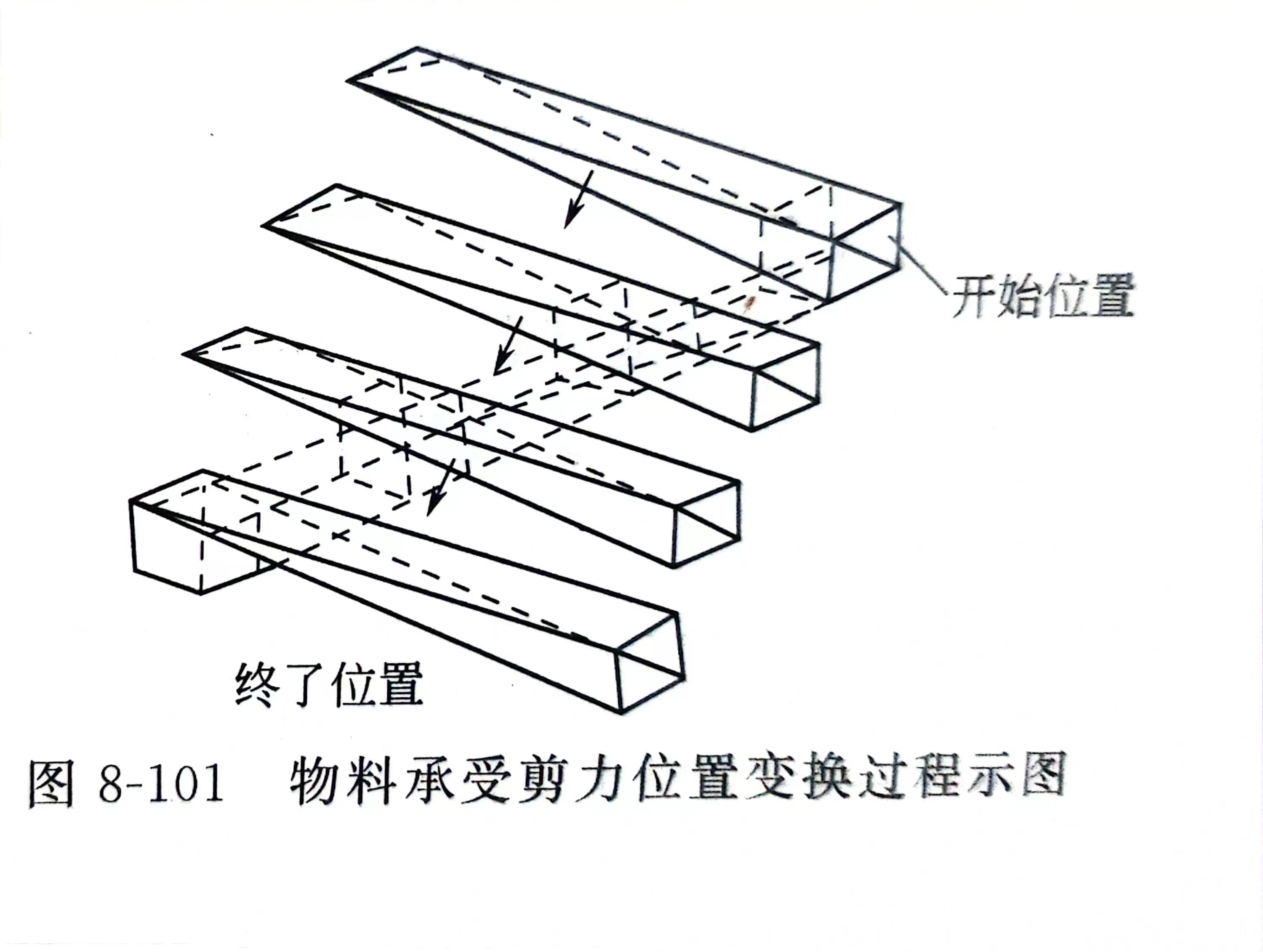 物料从螺杆的螺槽传到机简螺槽,或相反时,在机简和螺杆的分界面上将受到强剪切,而且剪切面是不断变化的,如图8-101所示。可把螺槽和机筒沟槽之间的相对运动看作是两个相交的楔形槽间的相对运动,在两个楔槽的相交位置处形成一个长方体,它的容积为一个常数。但是,在不同位置相交时,其长方体中的分界面是不断变化的。这意味着物料的受剪面不断改变,没有像在普通螺杆的螺槽内那样存在混合较差的核心部分,而物料所受的剪切作用是很均匀的。例如一个四头螺槽的螺杆和机筒,则每一条螺杆的螺槽总是与机简的四条螺槽相交于四点,在不同的运动时刻,其交点位置是不同的。这样,在位于同一螺杆螺槽的物料总是分成四份,分别向机筒的四个螺槽的某一段不断地供料,反过来也可以说是一个机简上的某段螺槽的物料是来自螺杆上四个不同的螺槽。在第二段中物料又从机简螺槽向螺杆螺槽中传递,而螺杆上同螺槽内的物料又来自机筒上四个不同的螺槽,这样,使同一螺槽中的物料达到既分割又汇合的目的,从而得到很好的交叉混合。