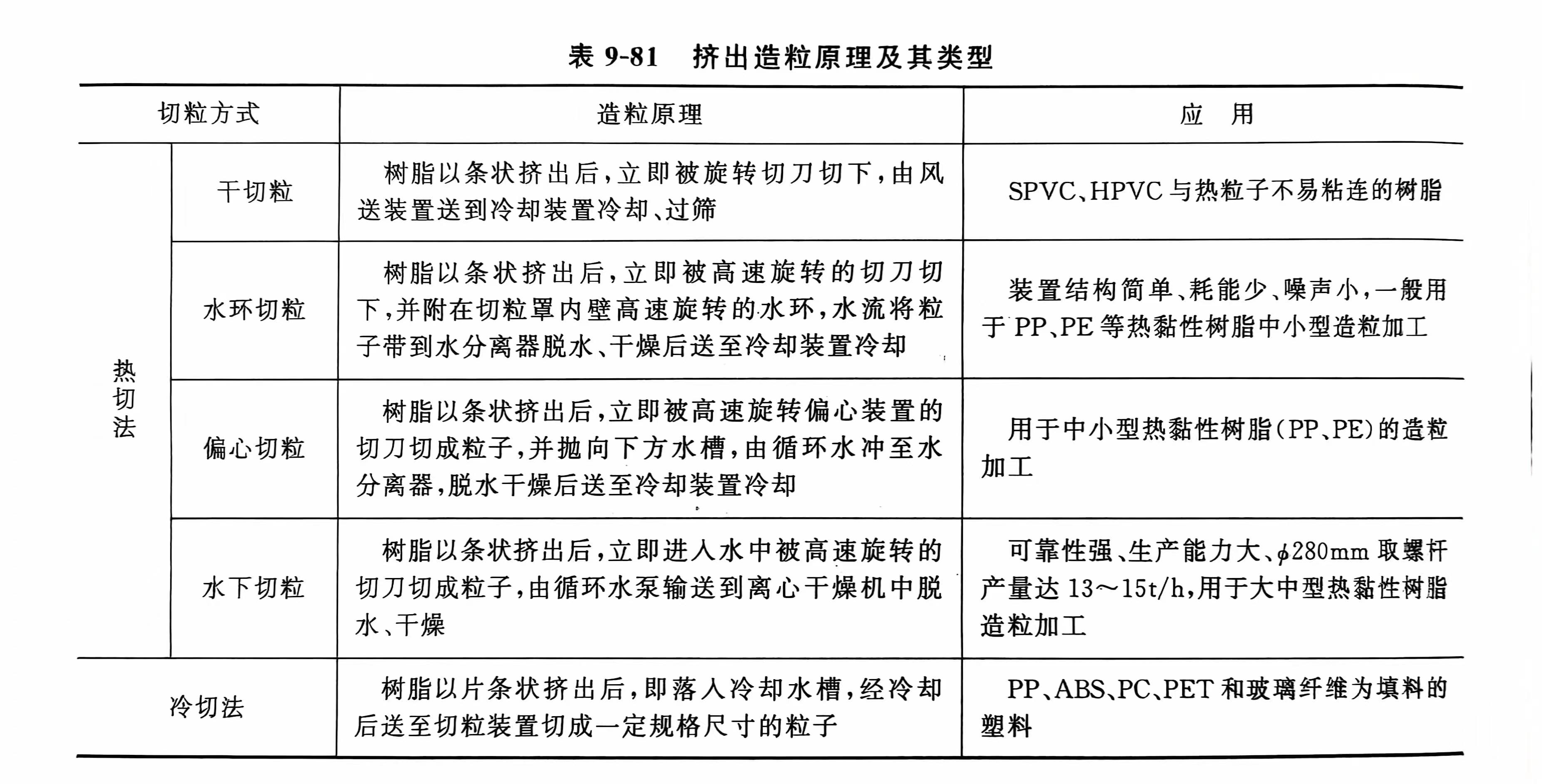 按造粒原理挤出造粒机组可分为热切和冷切造粒机组,而热切机组又可分为干切粒、水环切粒、水下切粒、偏心切粒机组等,如表9-81所示。