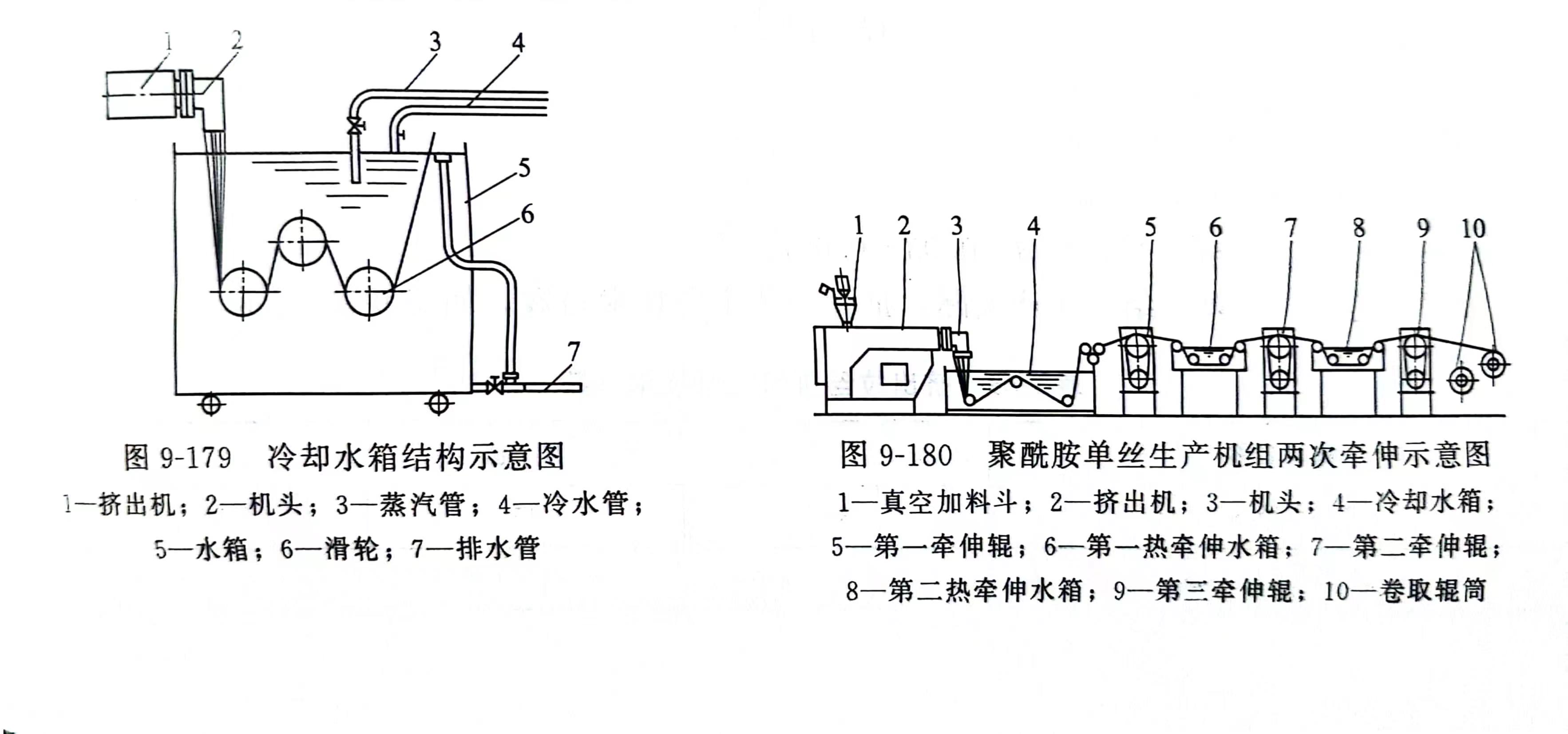 热牵伸可一次牵伸,也可两次牵伸,如图9-180所示,聚酰胶一般用两个热水箱两次牵伸。