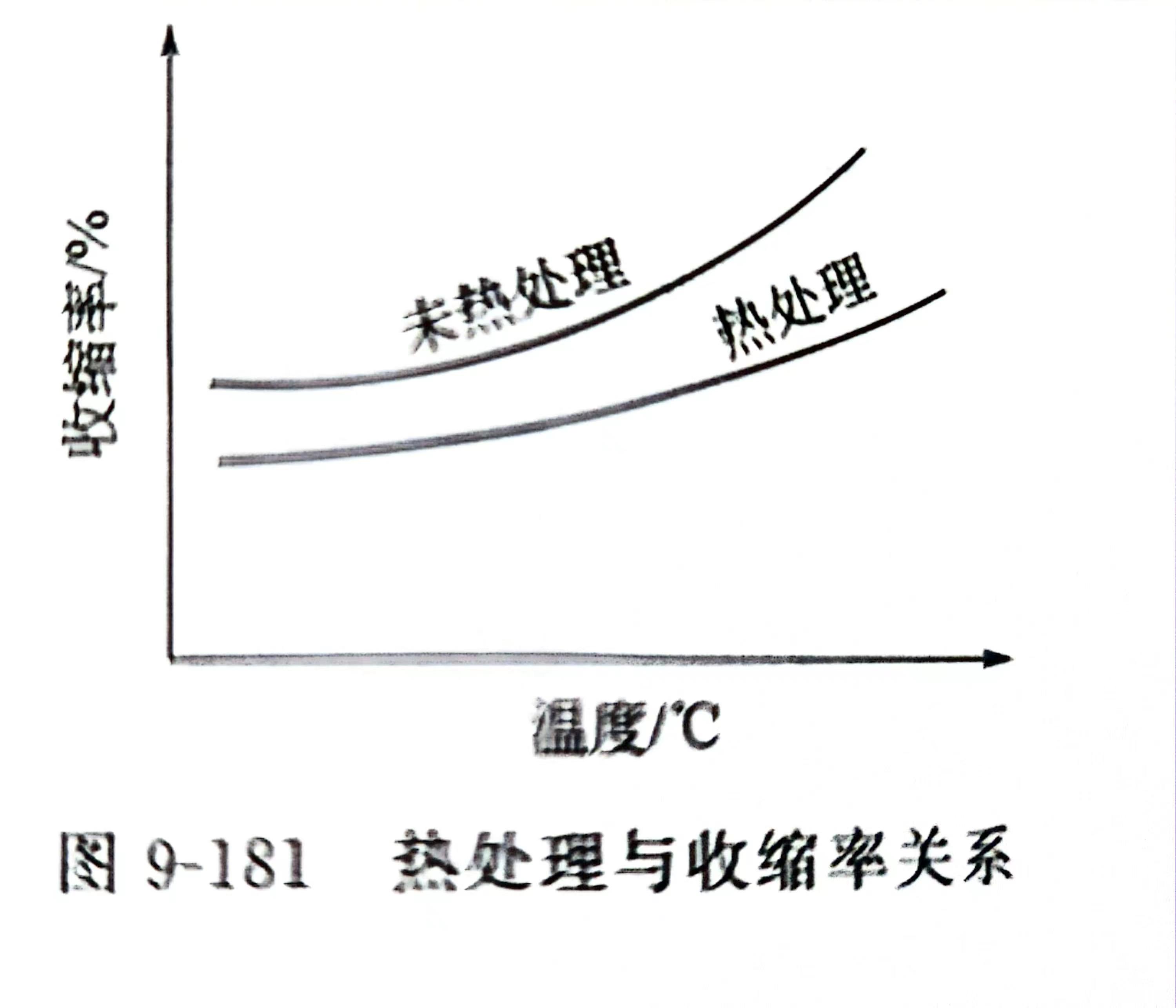 牵伸后的单丝,收缩率较大,在使用过程中受热收缩甚至会使制品损坏。通过热处理,其收缩率明显降低,如图9-181所示。热处理分湿法和干法两种。湿法装置的水箱尺寸与热牵伸水箱相同,其成本低、操作方便。干法装置采用热烘箱,对减少单丝中水分含量有利,且装置也不复杂。热处理导辊速度比第二牵伸辊速度减小2%~5%,让单丝发生松弛、回缩。