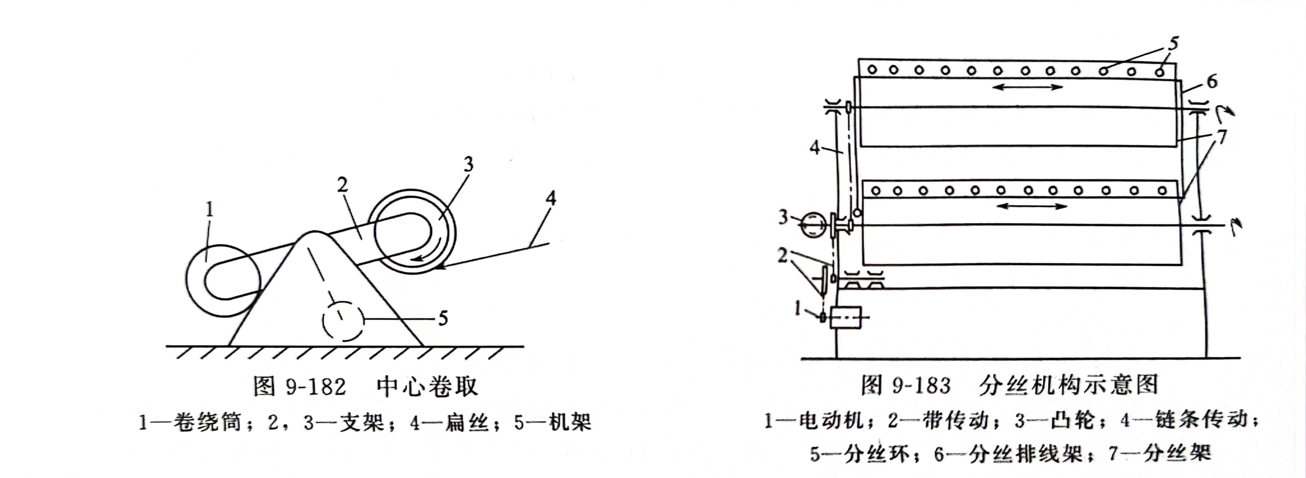 单丝的卷取多采用中心卷取,如图9-182所示。卷取的方式有两种:一种是将单丝分开卷在各自的卷筒上(图9-183),每卷约1kg;另一种是多根单丝合股卷在一个卷取筒上,每卷5~8kg,然后再用分丝机分成单丝,如图9-183所示。为了保证卷取质量,要求卷取张力恒定(卷取线速度恒定),目前普遍采用力矩电动机,保证卷取时张力恒定。单丝的卷取线速度通常为100~250m/min。
