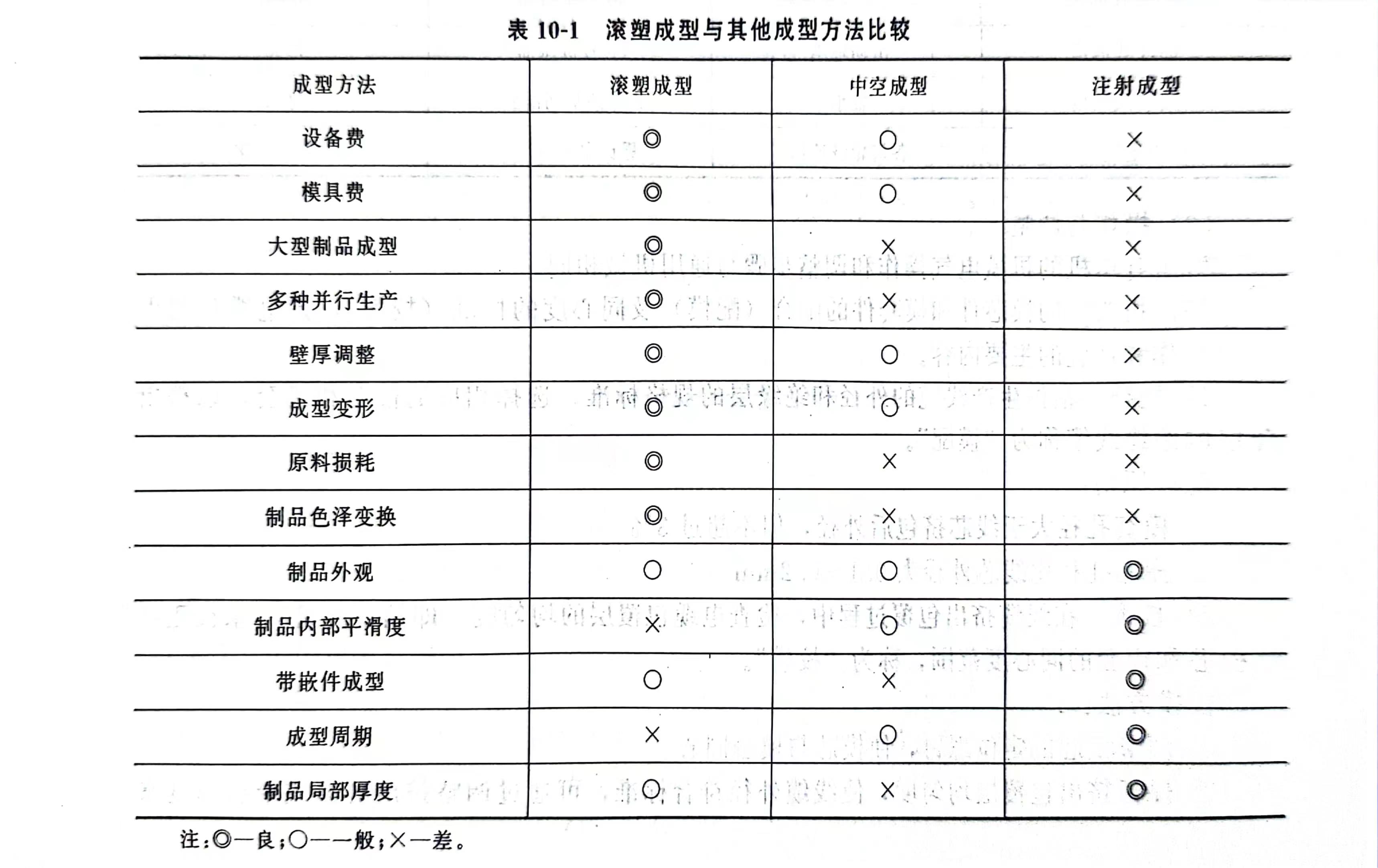 目前,国外滚塑成型用的树脂已形成系列,并扩展到交联和热固性树脂领域,其制品正向大型化发展,制品结构向复合、增强方面发展,设备向自动化、高速化方面发展。滚塑成型不同于注射成型及中空成型,其特点如表10-1所示。