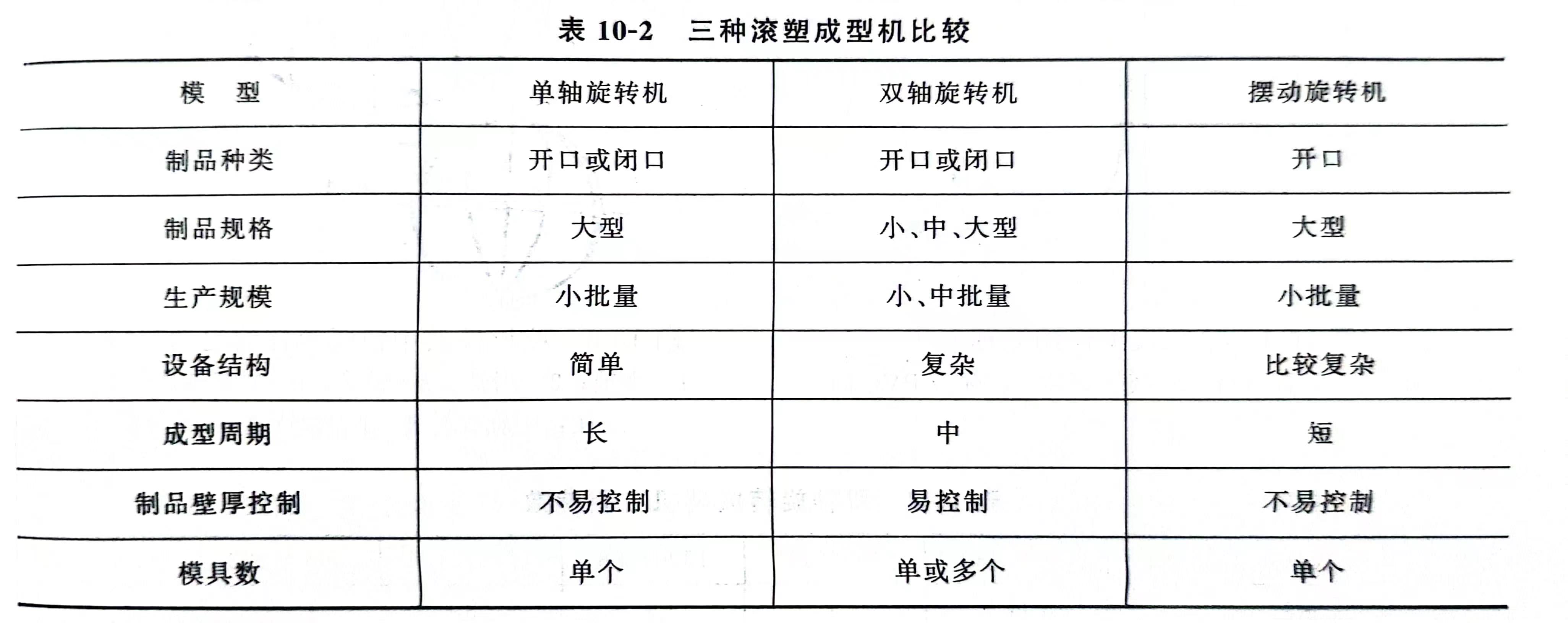 滚塑成型机按模具的旋转方式不同大致分三种类型(表10-2)。