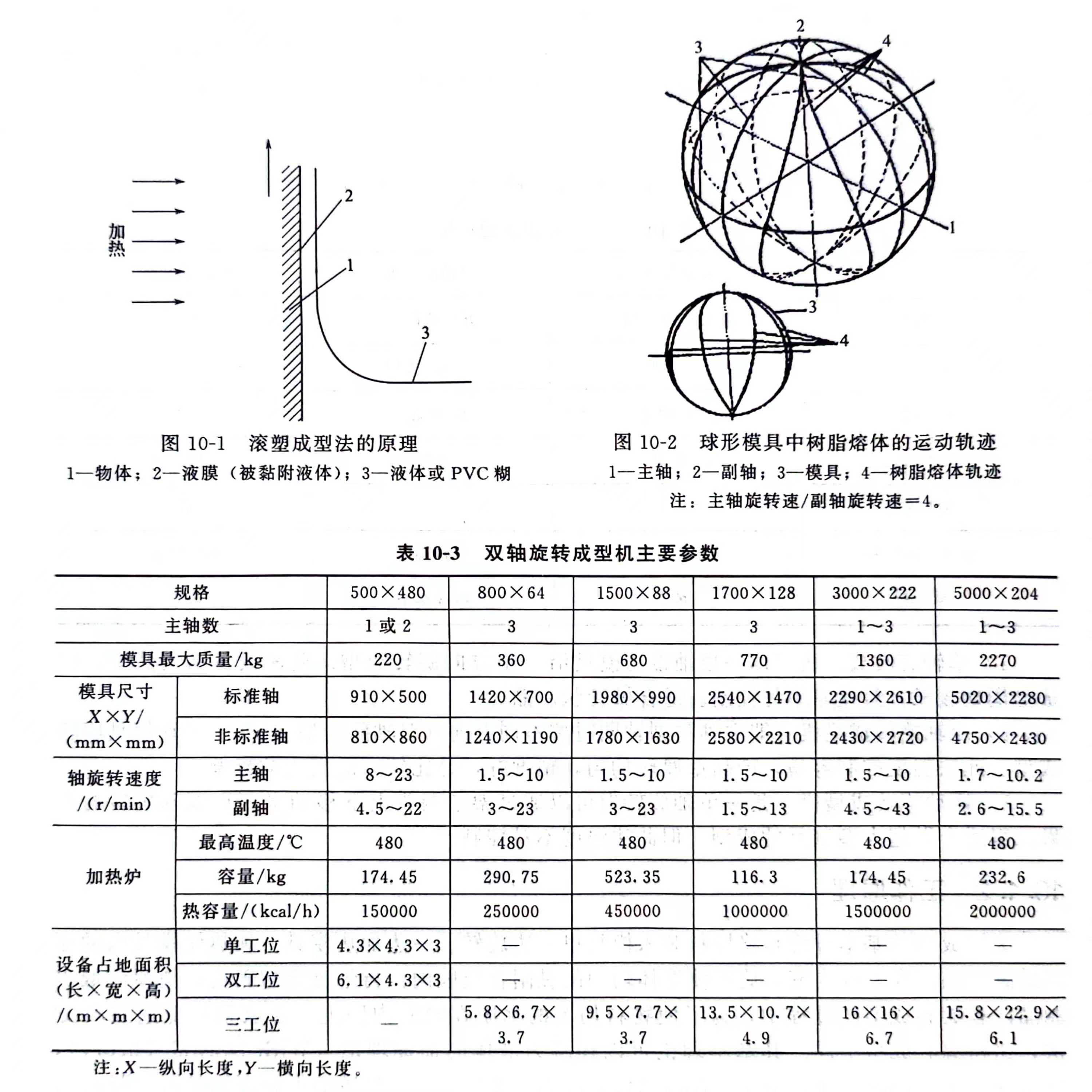 2)双轴旋转成型机即主轴与副轴同时按不同方向(双轴间一般成90°)带动模具旋转成型。此法温度控制容易,产品壁厚较均匀,精度好,是比较广泛使用的机型。